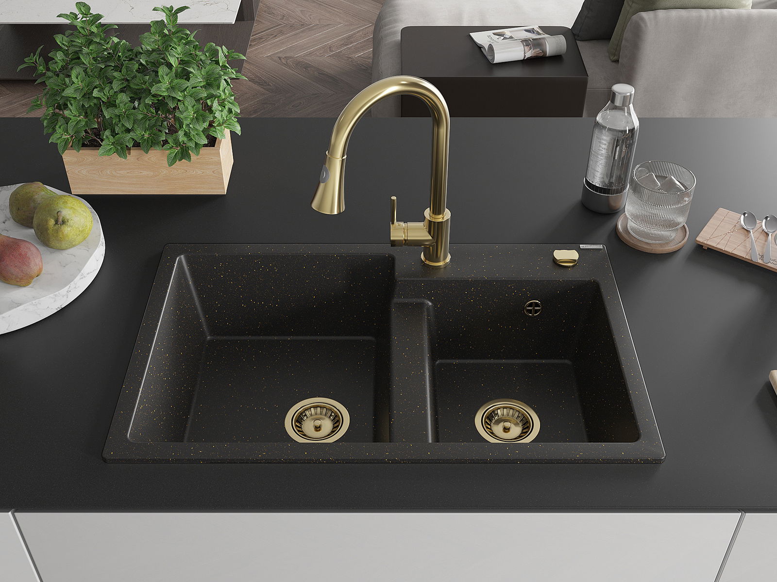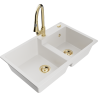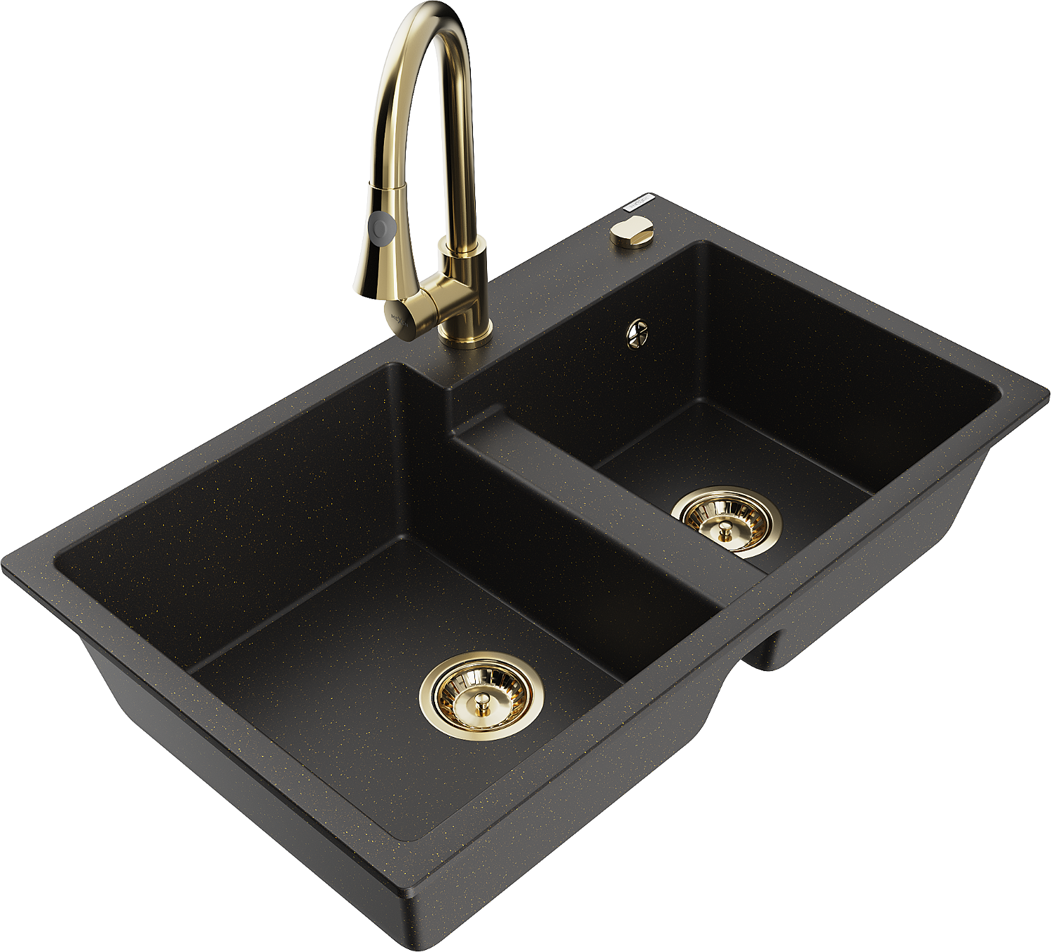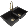 Mexen Tomas 2-kamrás gránit mosogató Elia konyhai csappal, fekete/arany metál - 6516-75-670101-50
