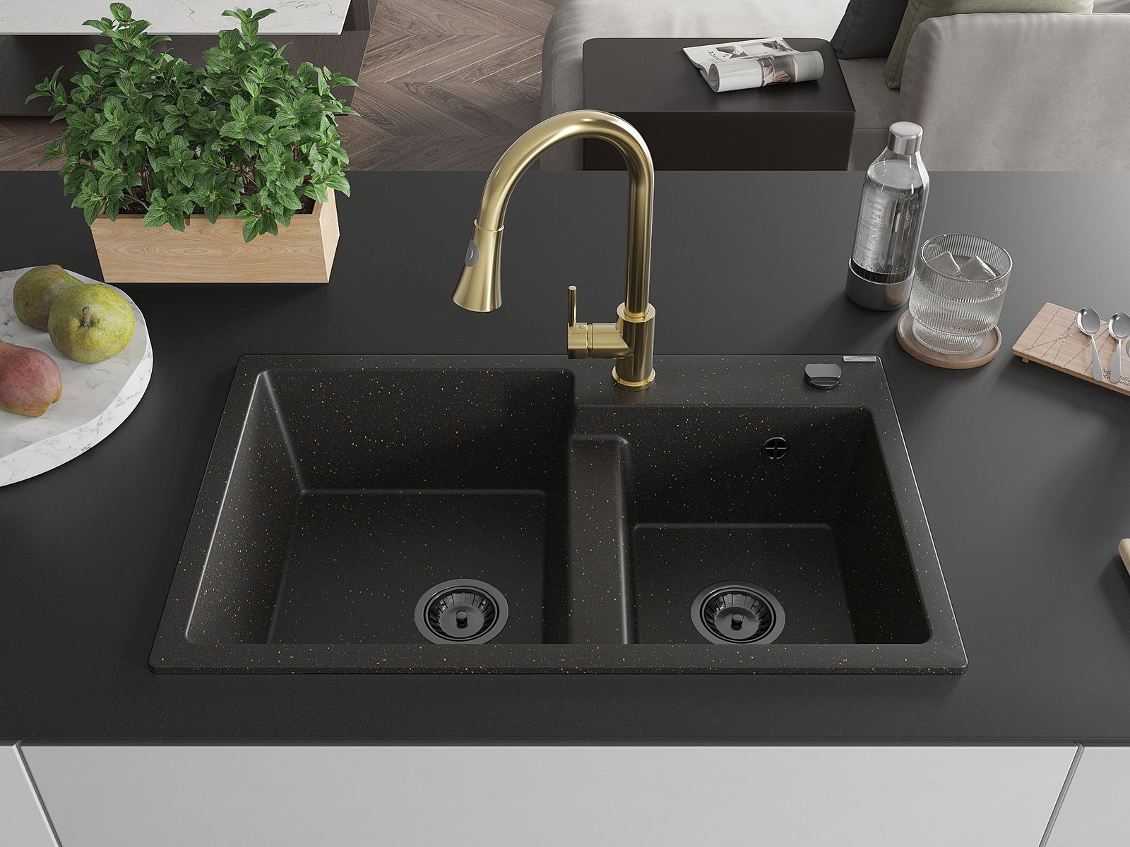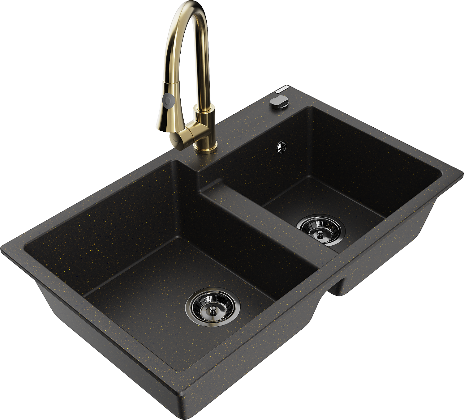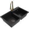 Mexen Tomas 2 rekeszes gránit mosogató Elia konyhai csapteleppel, fekete/arany metál - 6516-75-670101-50-B