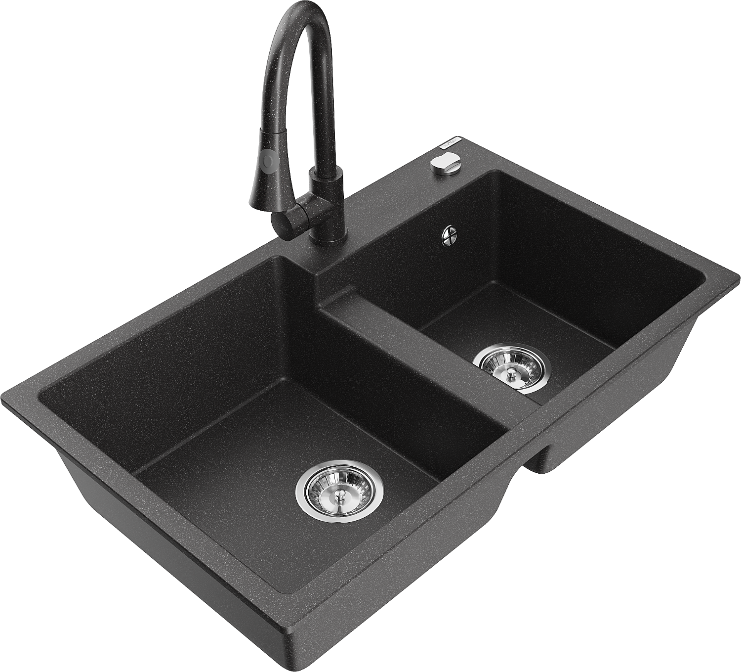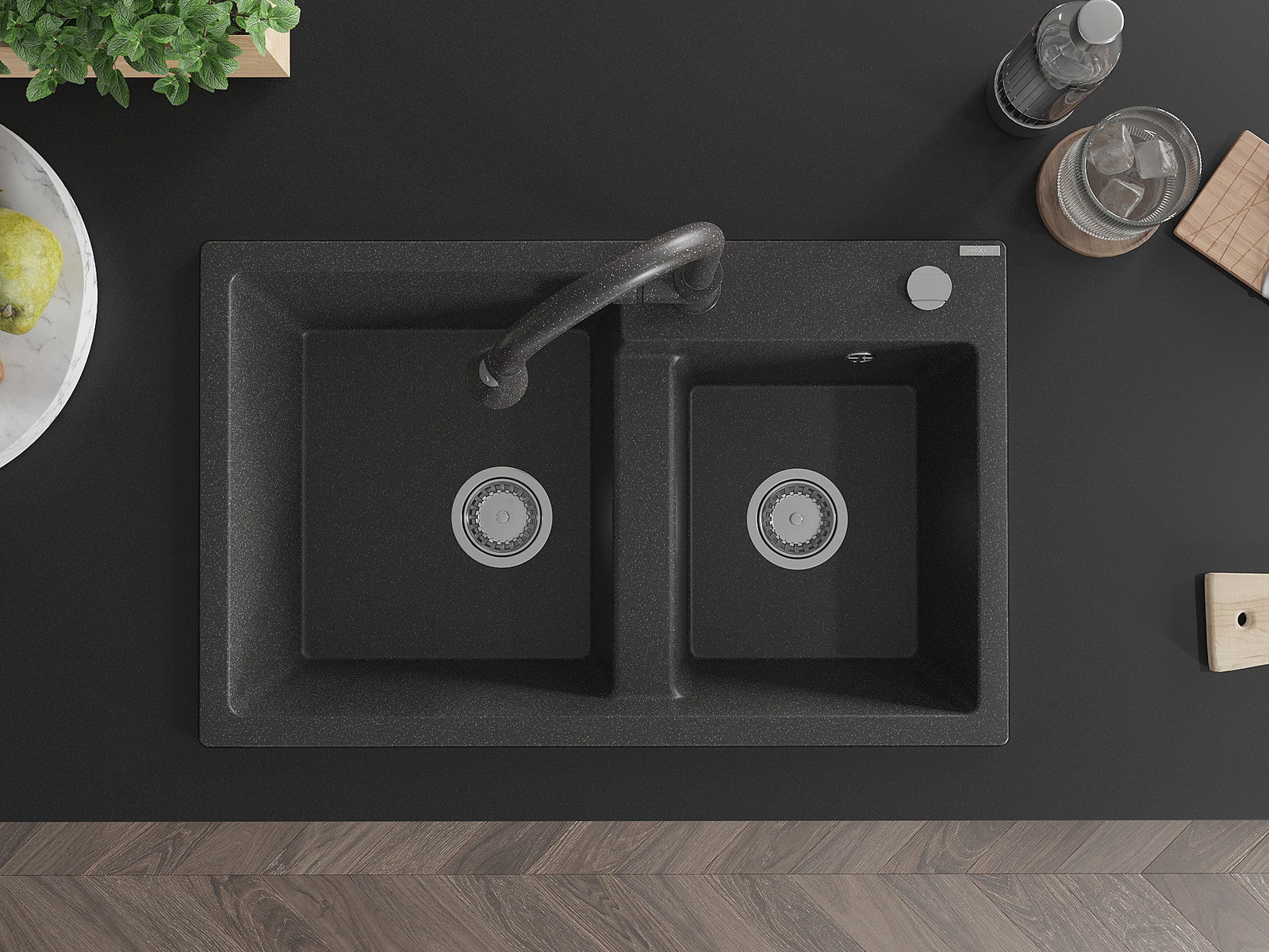 Mexen Tomas gránit konyhai mosogató 2 medencés Elia csapteleppel, fekete pöttyös - 6516-76-670101-76