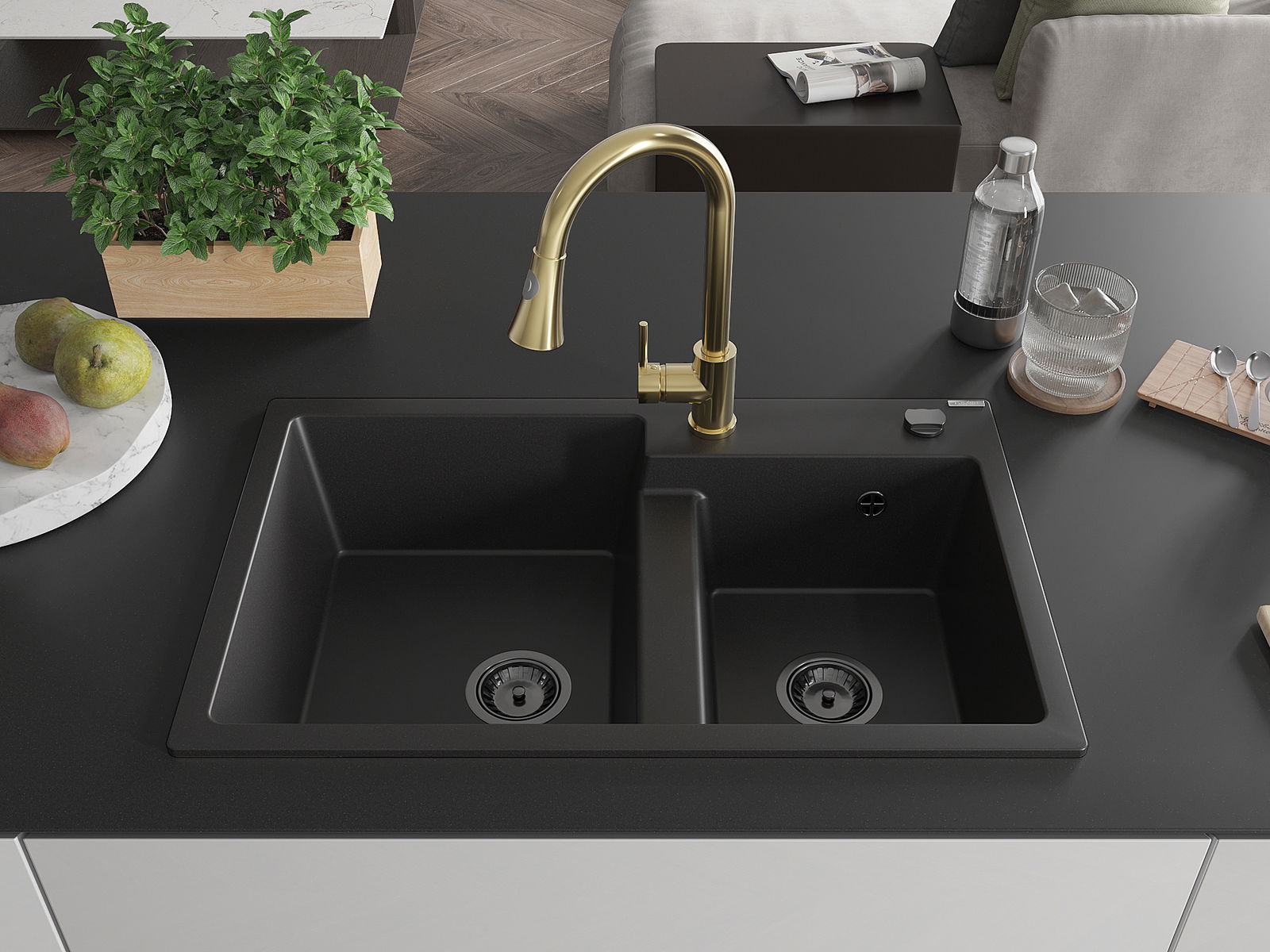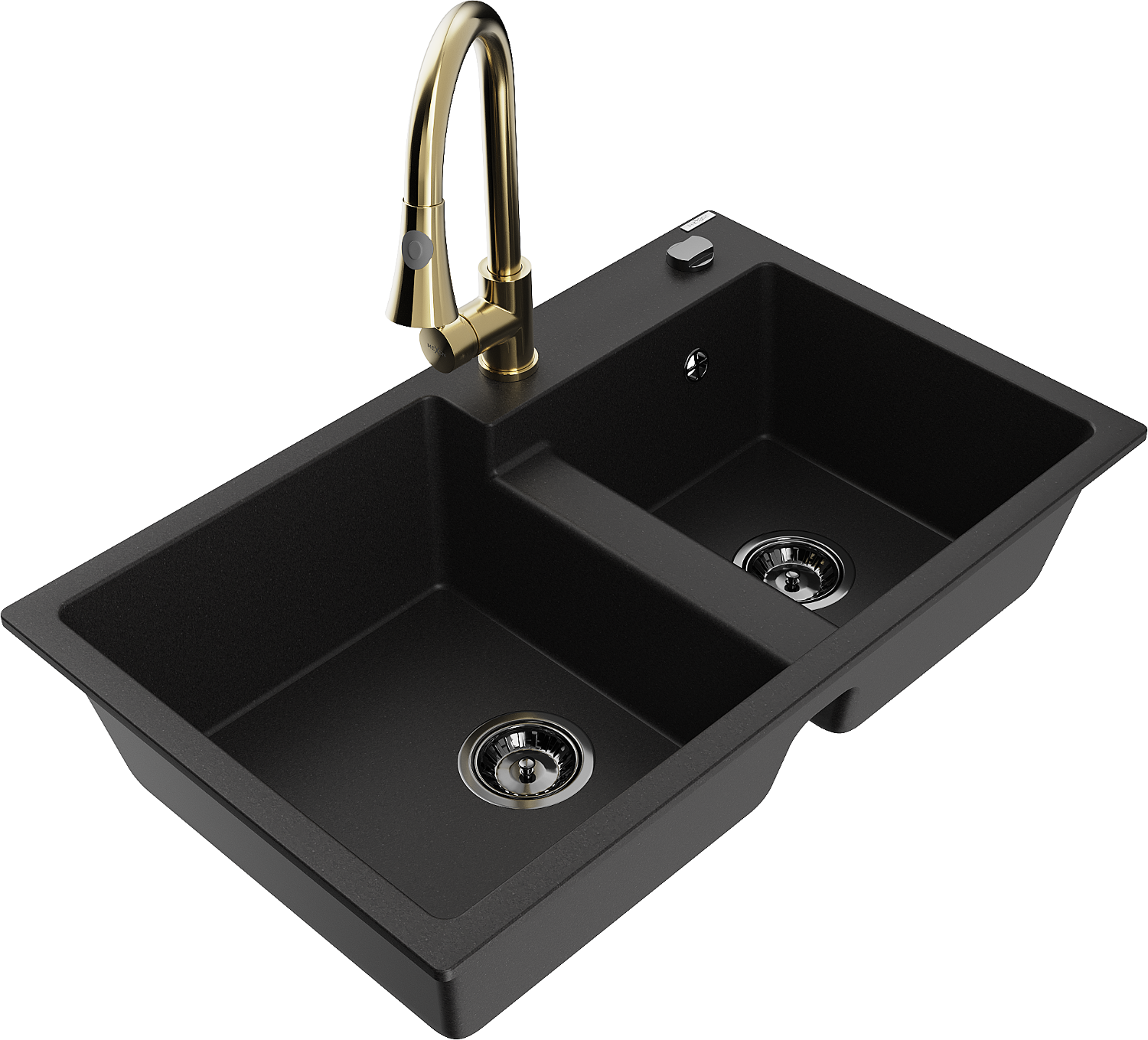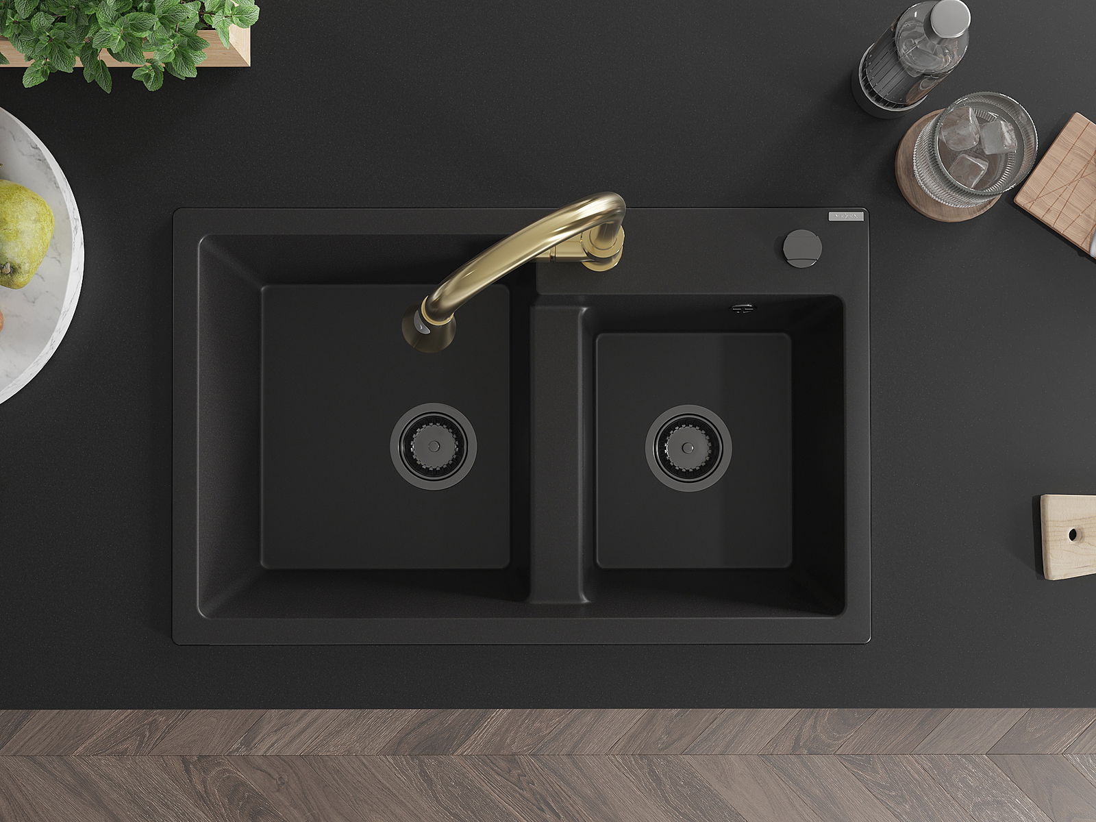Mexen Tomas kétkamrás gránit mosogató Elia konyhai csapteleppel, fekete - 6516-77-670101-50-B
