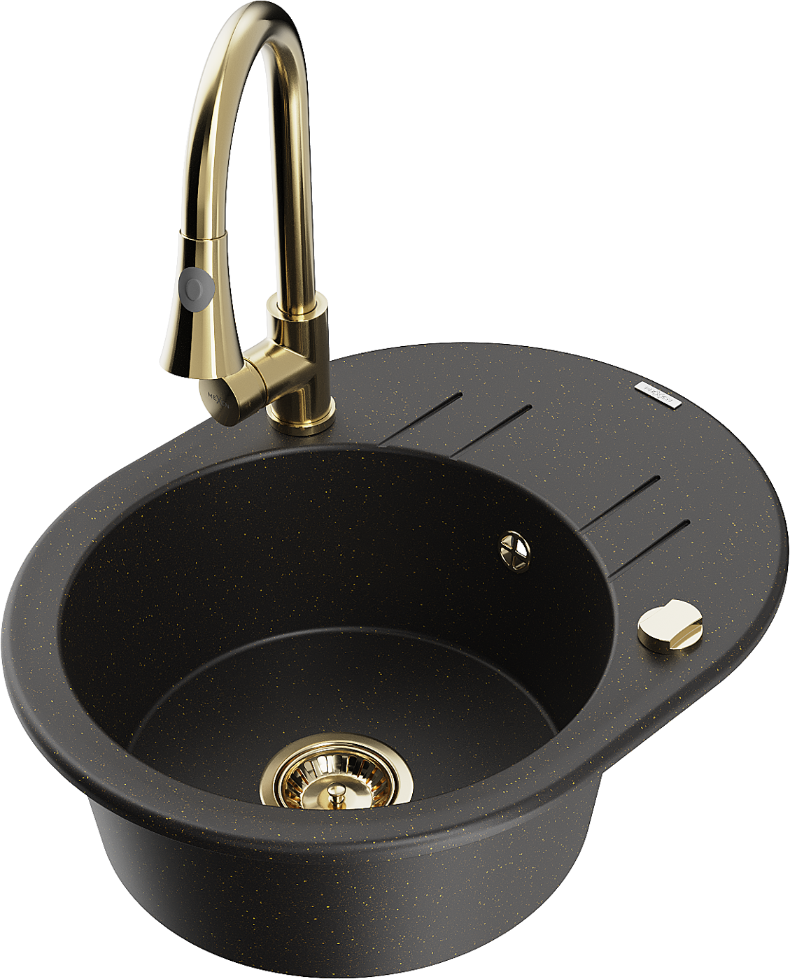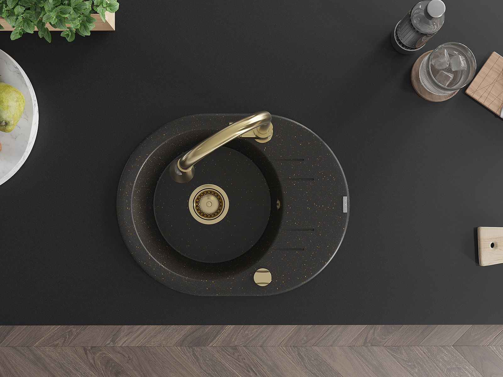 Mexen Kevin gránit mosogató 1-medencés csepegtetővel és Elia konyhai csapteleppel, fekete/arany metál - 6517-75-670101-50