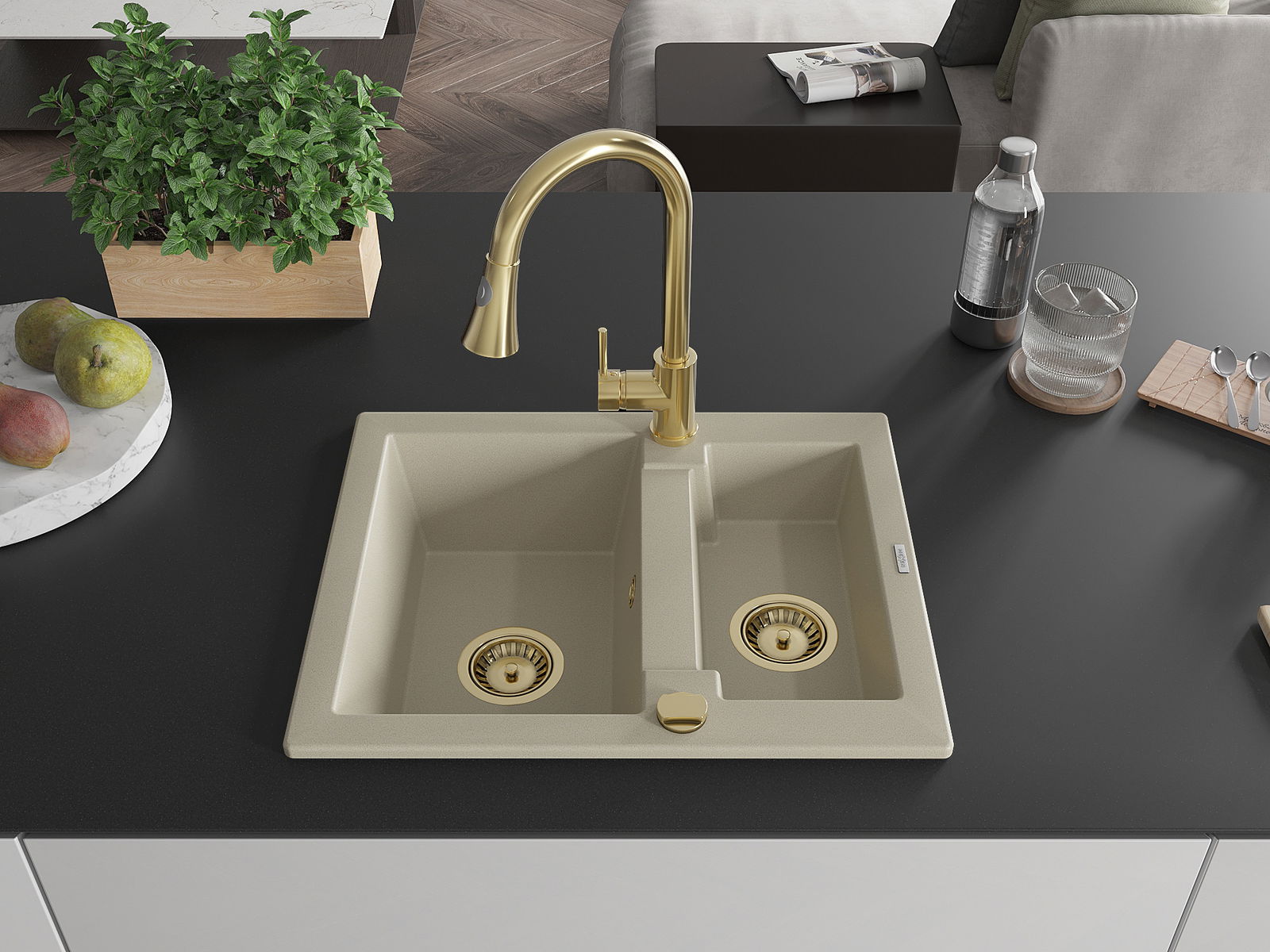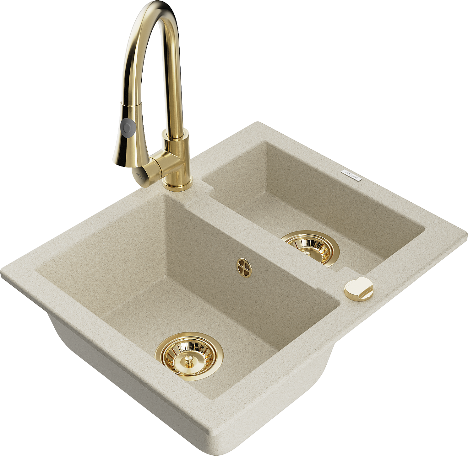 Mexen Carlos gránit mosogató 1,5 medencével és Elia konyhai csapteleppel, bézs - 6518-69-670101-50