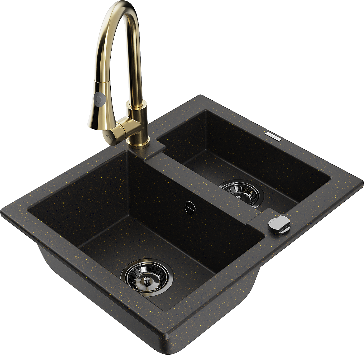 Mexen Carlos 1,5 rekeszes gránit mosogató Elia konyhai csappal, fekete/arany metál - 6518-75-670101-50-B