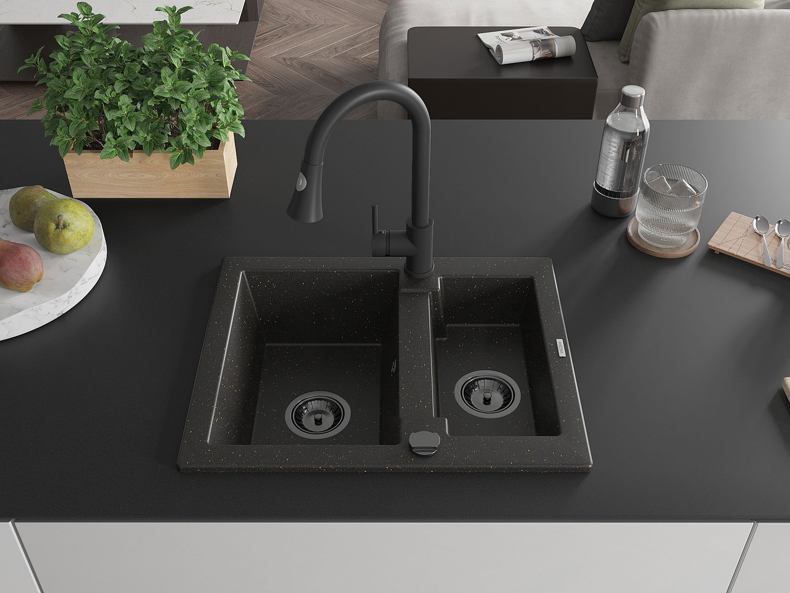 Mexen Carlos 1,5 medencés gránit mosogató Elia konyhai csapteleppel, fekete/arany metál - 6518-75-670101-70-B