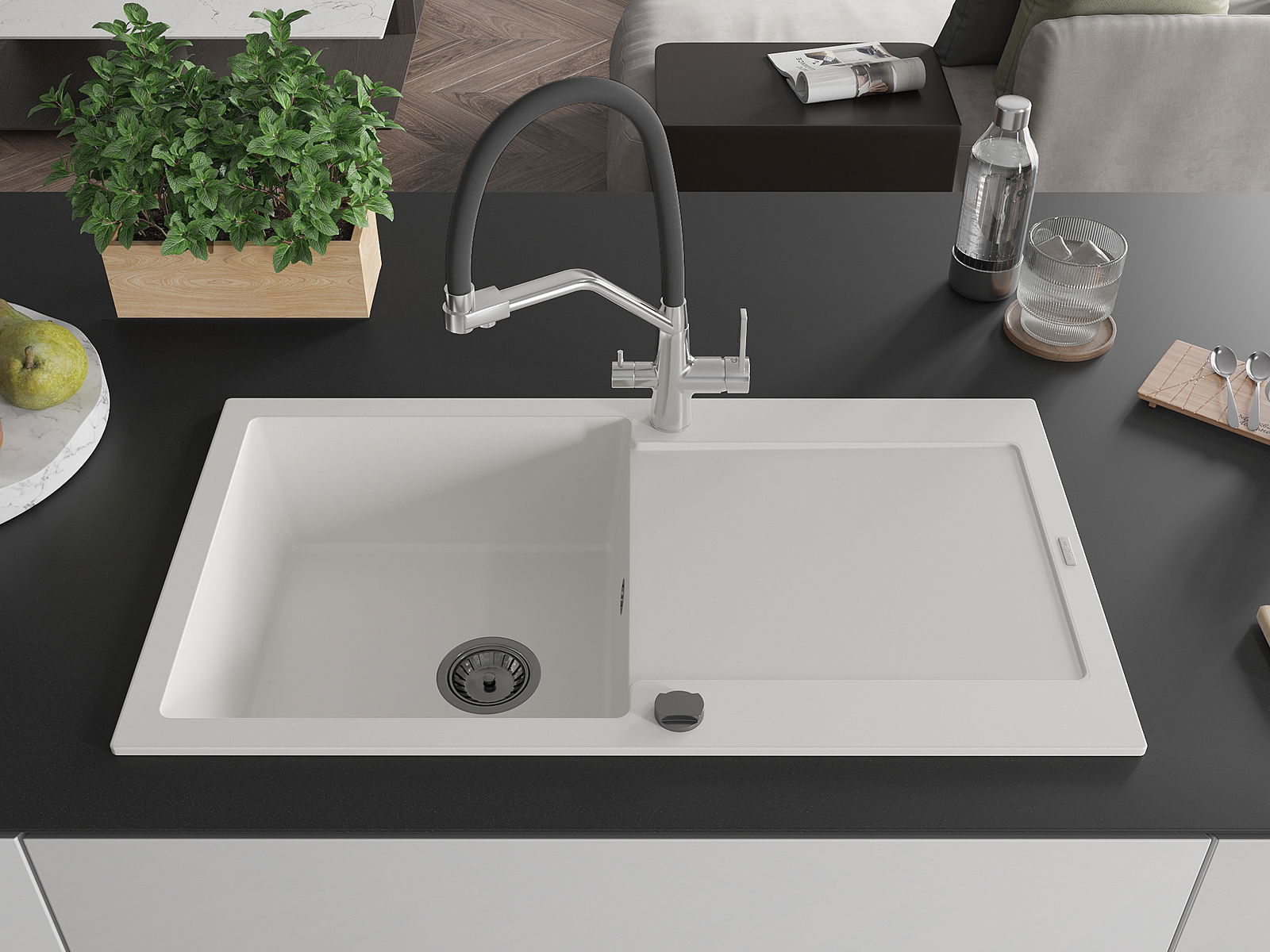 A mosogató kiváló minőségű gránitból készül. Ez egy elegáns és mindenekelőtt minden konyhához praktikus kiegészítés, stílusától függetlenül. A kiváló minőségű és a gránit tartósság biztosítja a sok éves használatát.