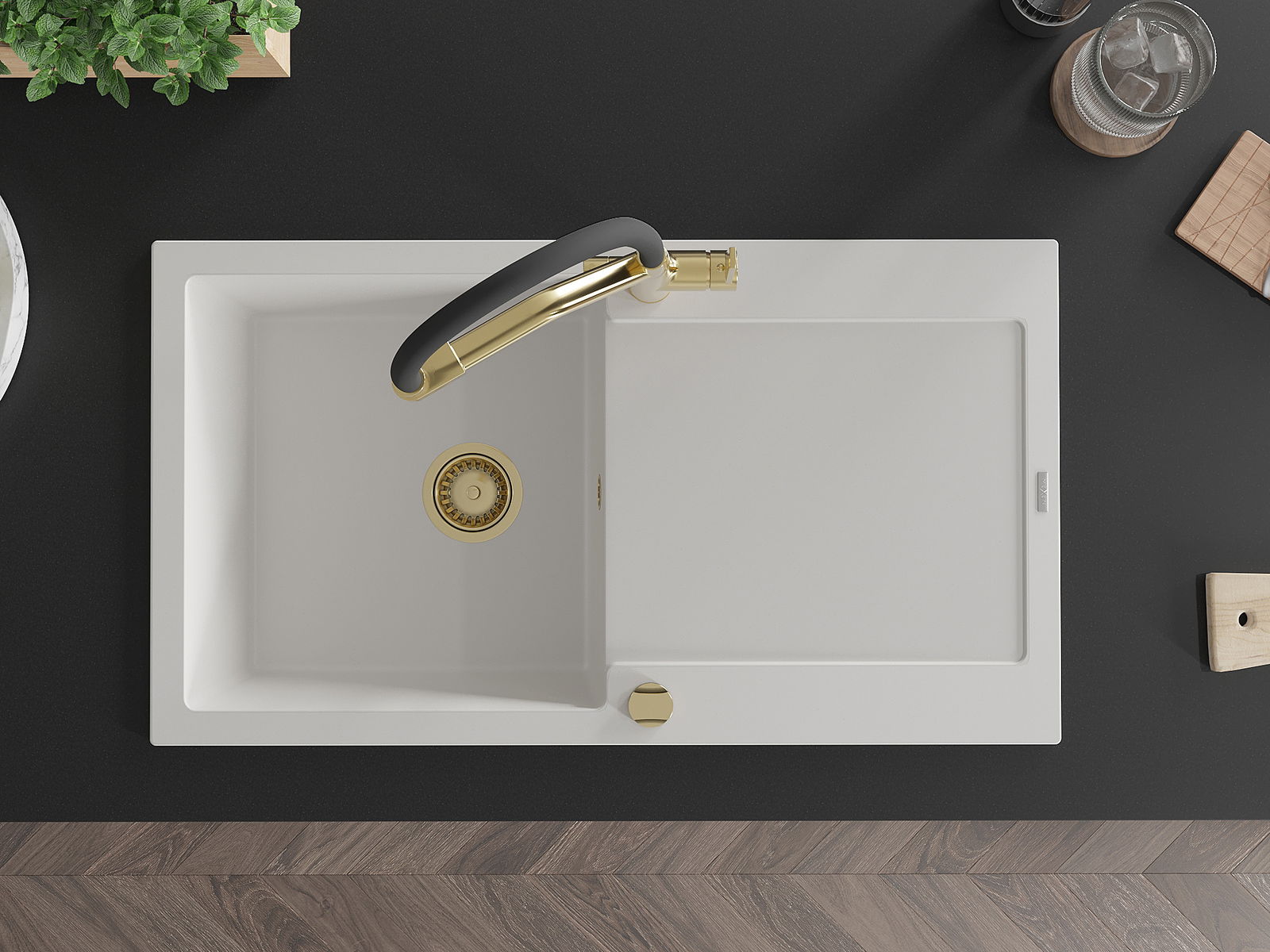 Mexen Leo 1-medencés gránit mosogató csepegtetővel és Duo konyhai csapteleppel, fehér - 6501-20-671701-57-G
