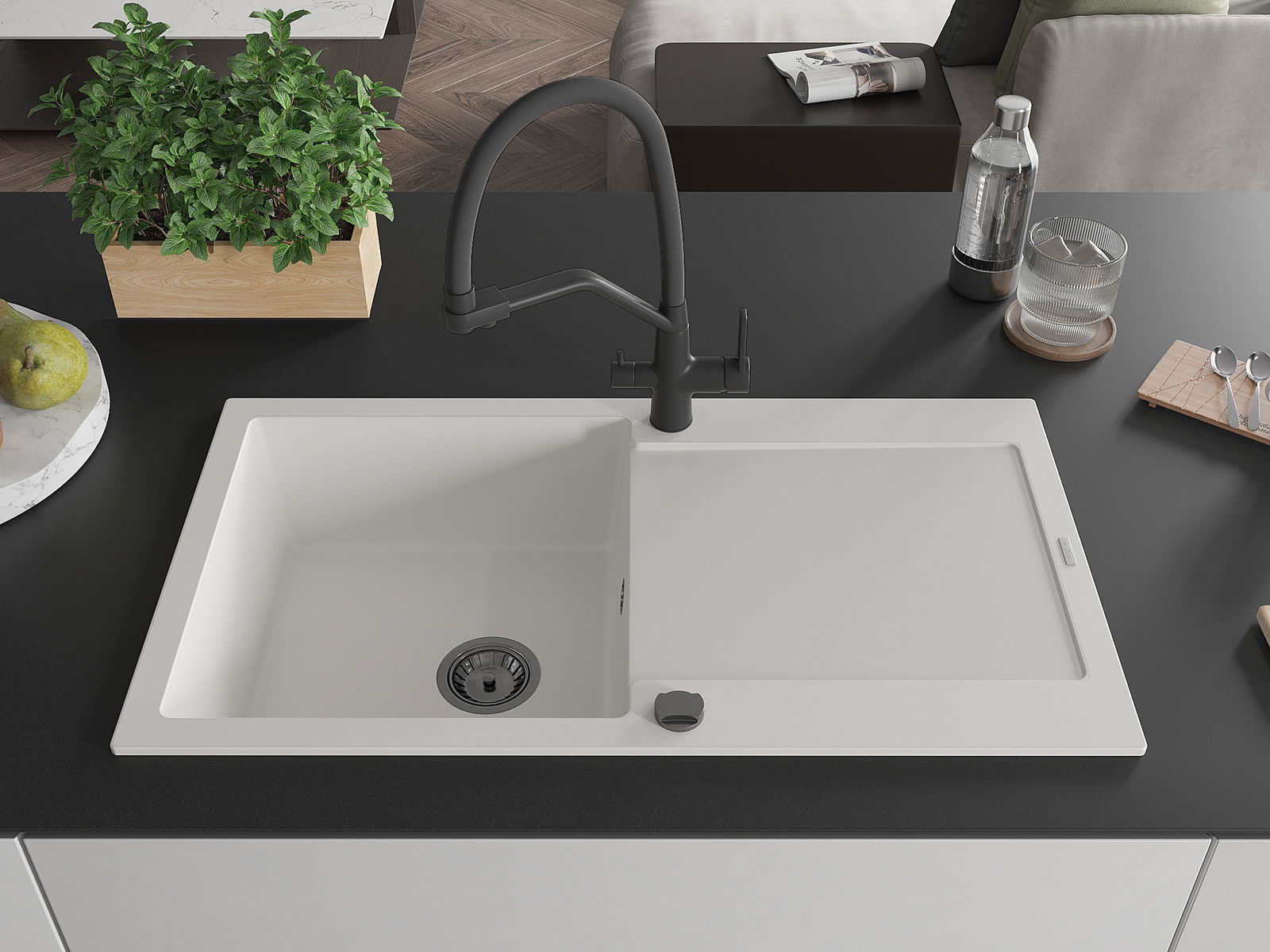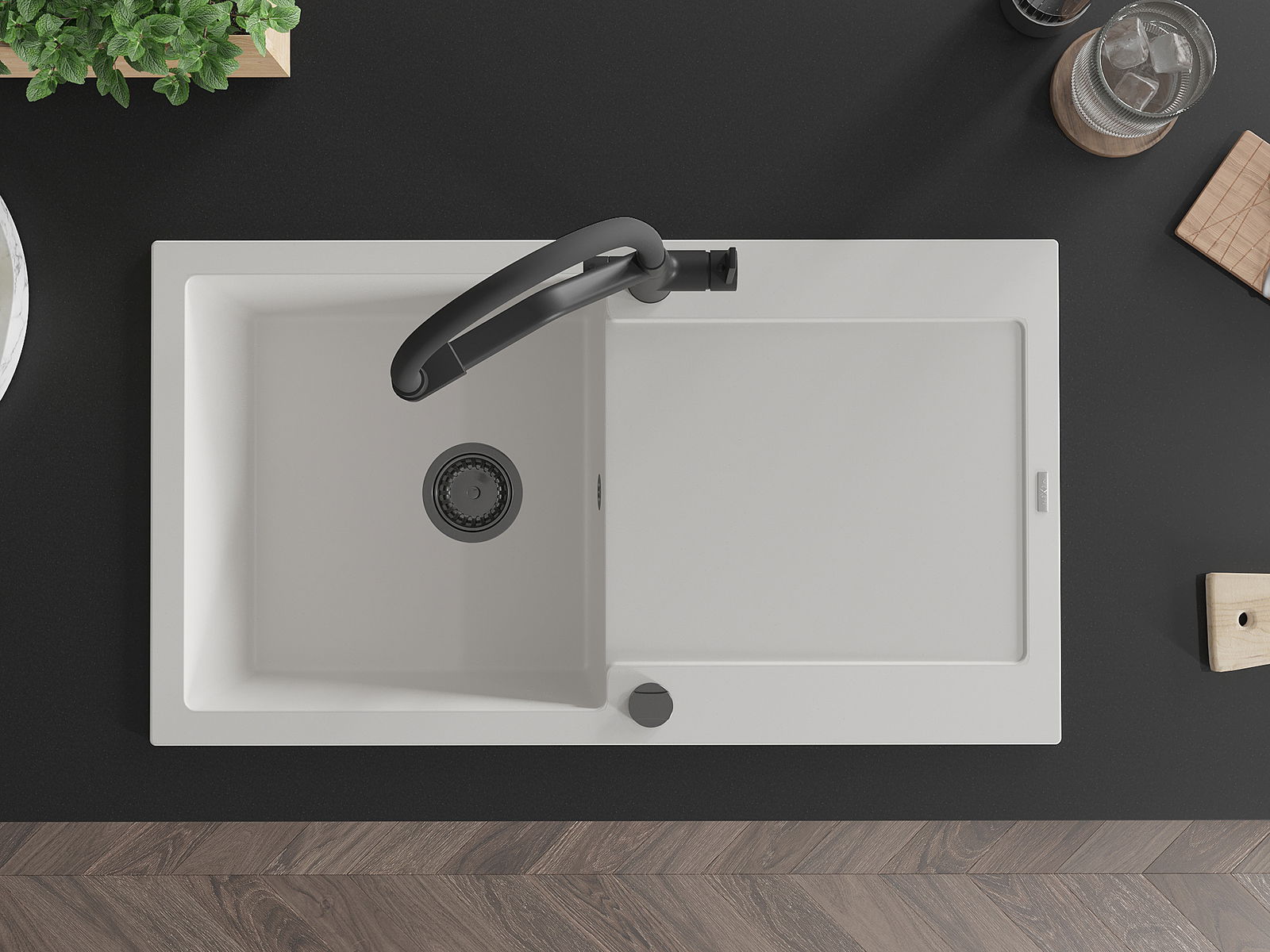 A mosogató kiváló minőségű gránitból készül. Ez egy elegáns és mindenekelőtt minden konyhához praktikus kiegészítés, stílusától függetlenül. A kiváló minőségű és a gránit tartósság biztosítja a sok éves használatát.