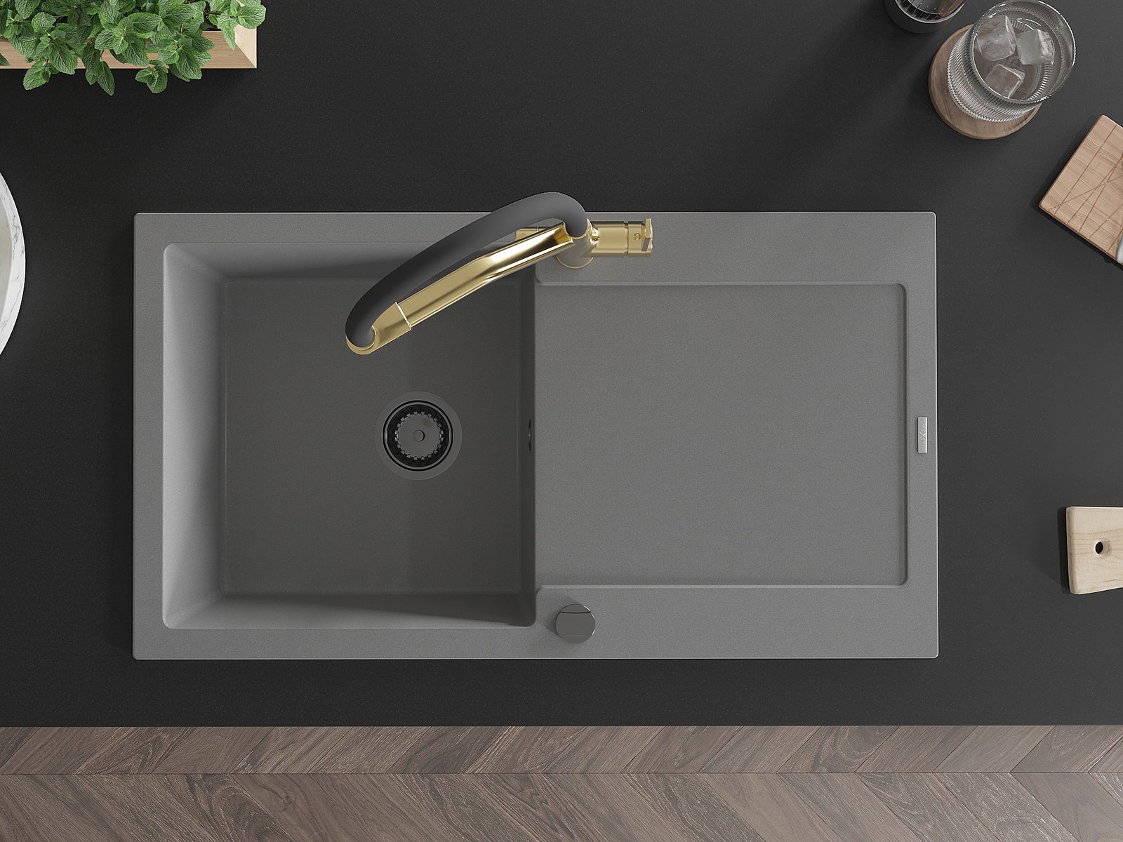 Mexen Leo egymedencés gránit mosogató lefolyóval és Duo konyhai csapteleppel, szürke - 6501-71-671701-57-B