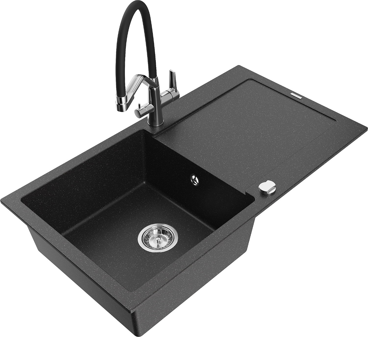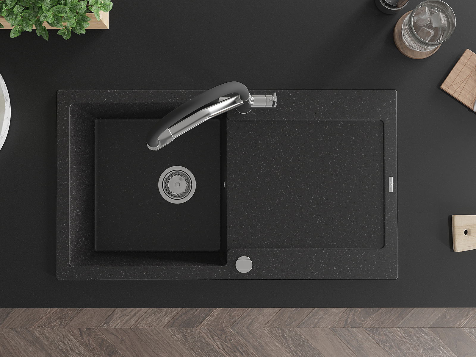 Mexen Leo egymedencés gránit mosogatótálca csepegtetővel és Duo konyhai csapteleppel, fekete/ezüst metál - 6501-73-671701-07