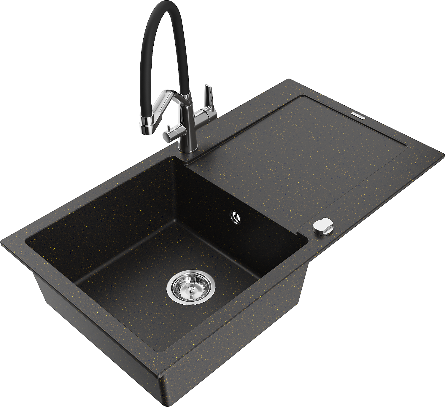 Mexen Leo gránit mosogató 1-medencés csepptálcával és konyhai csapteleppel Duo, fekete/arany metál - 6501-75-671701-07