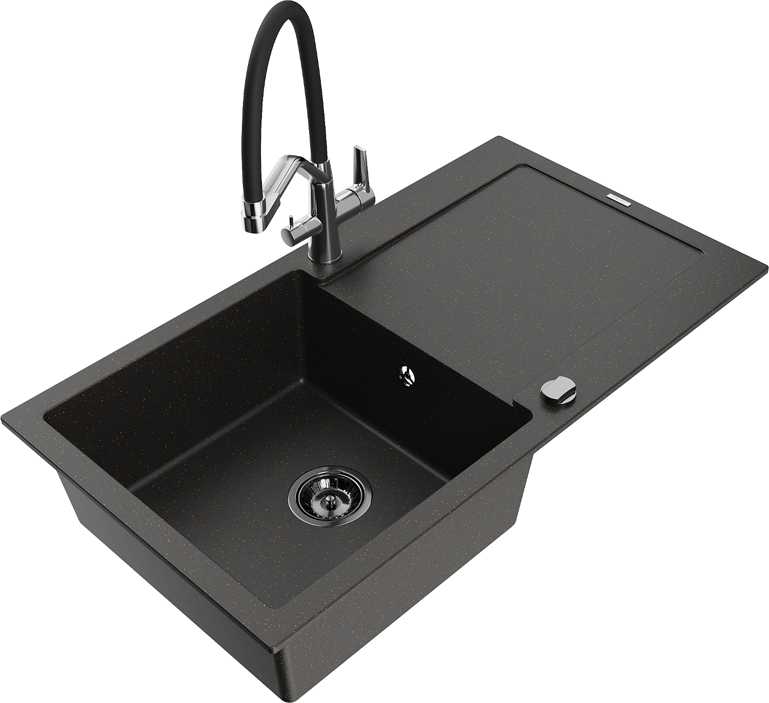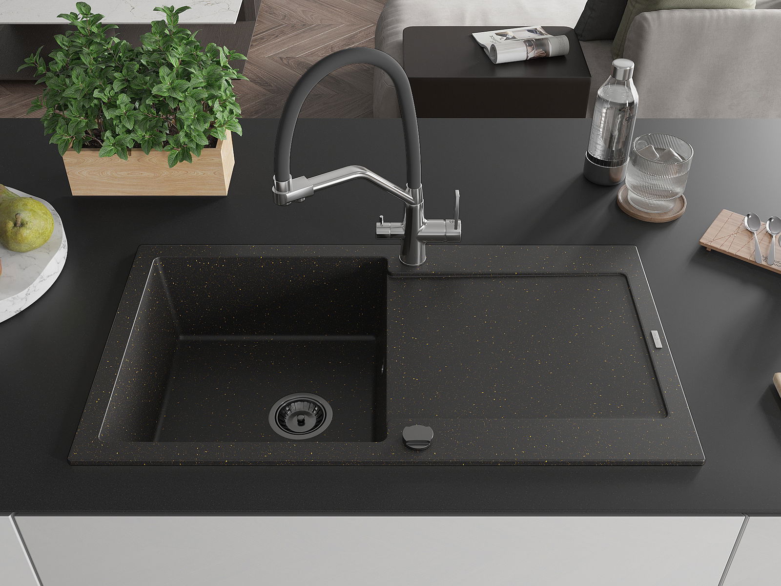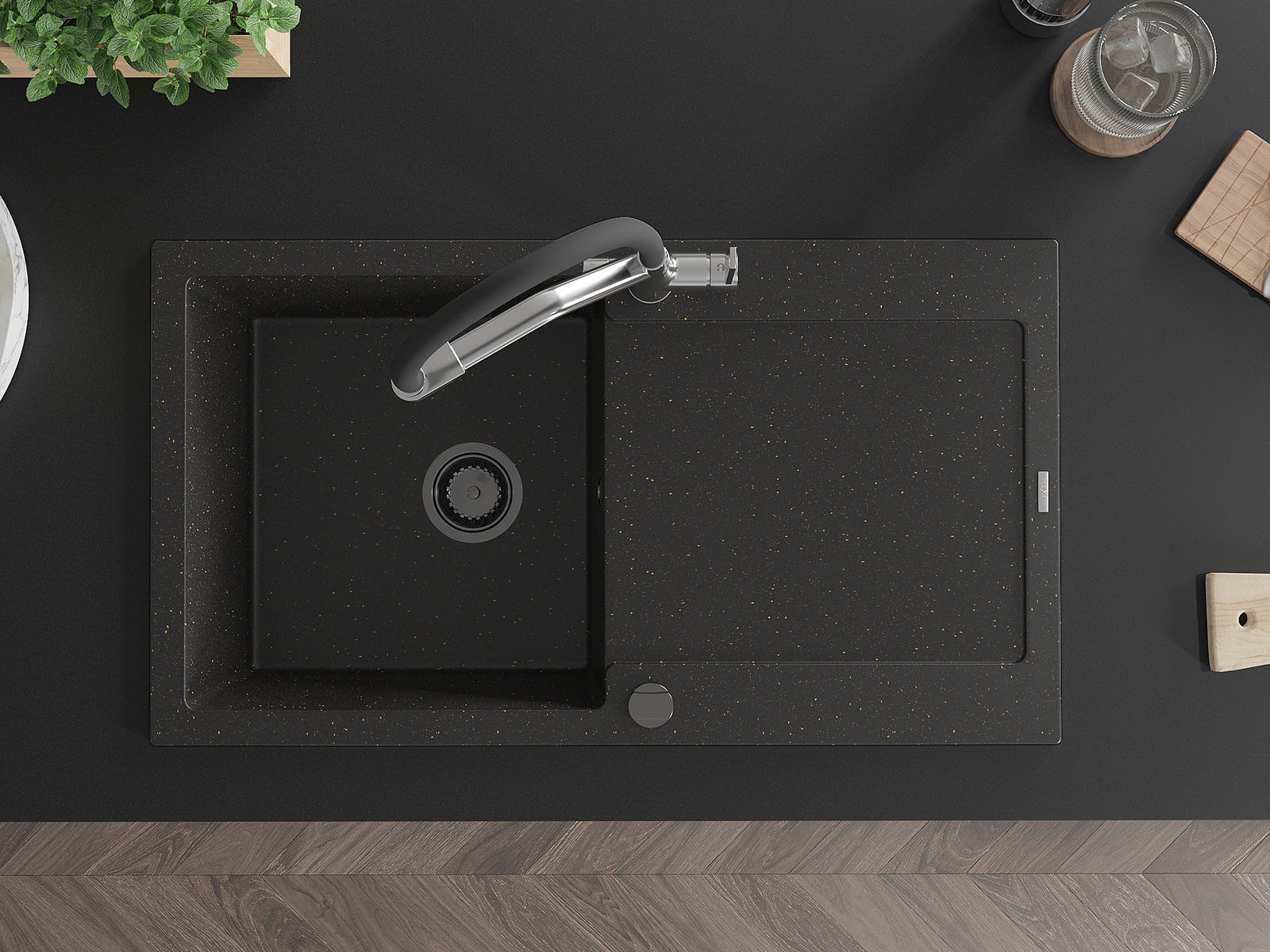 Mexen Leo egymedencés gránit mosogató csepegtetővel és Duo konyhai csapteleppel, fekete/arany metál - 6501-75-671701-07-B