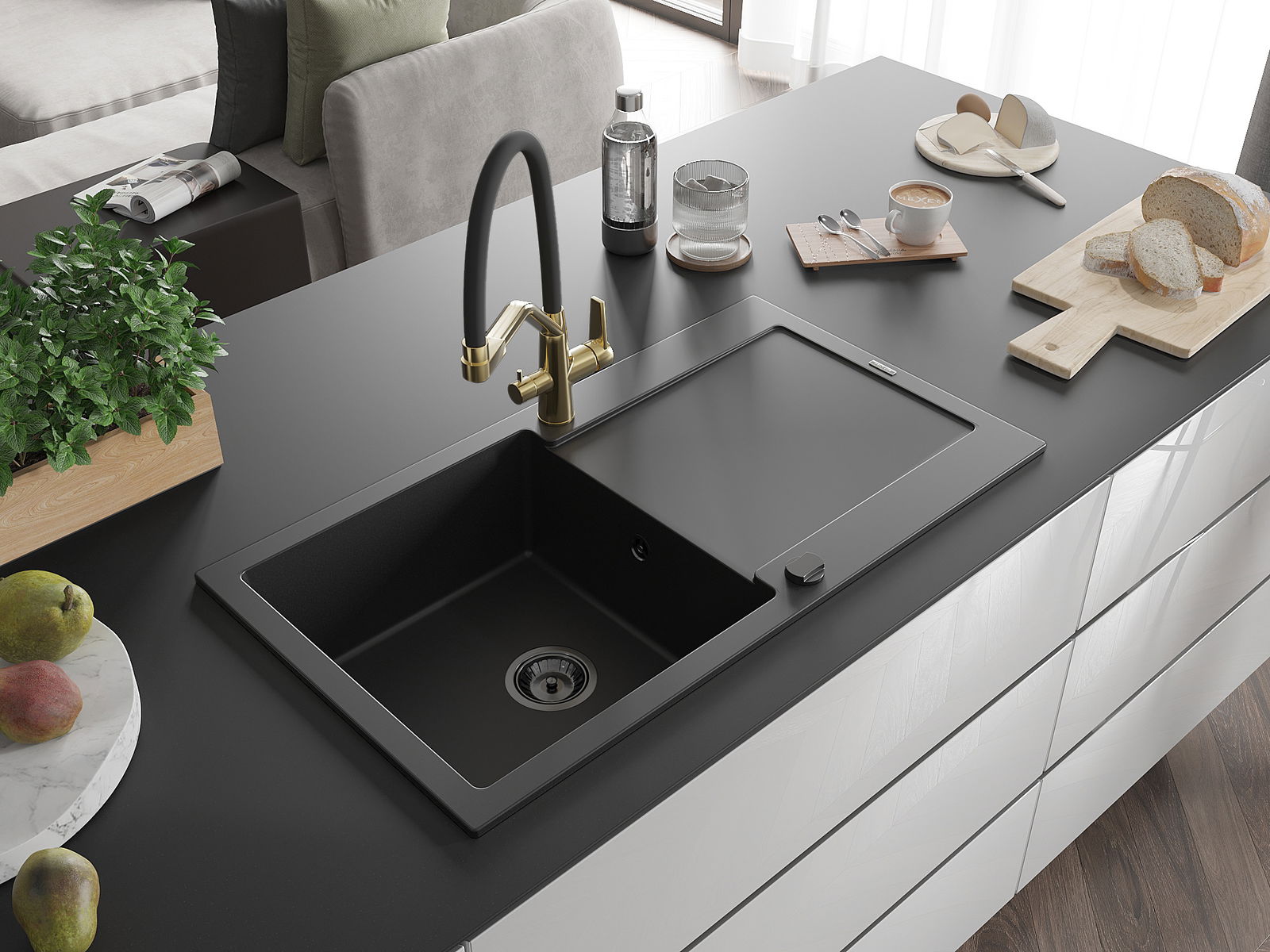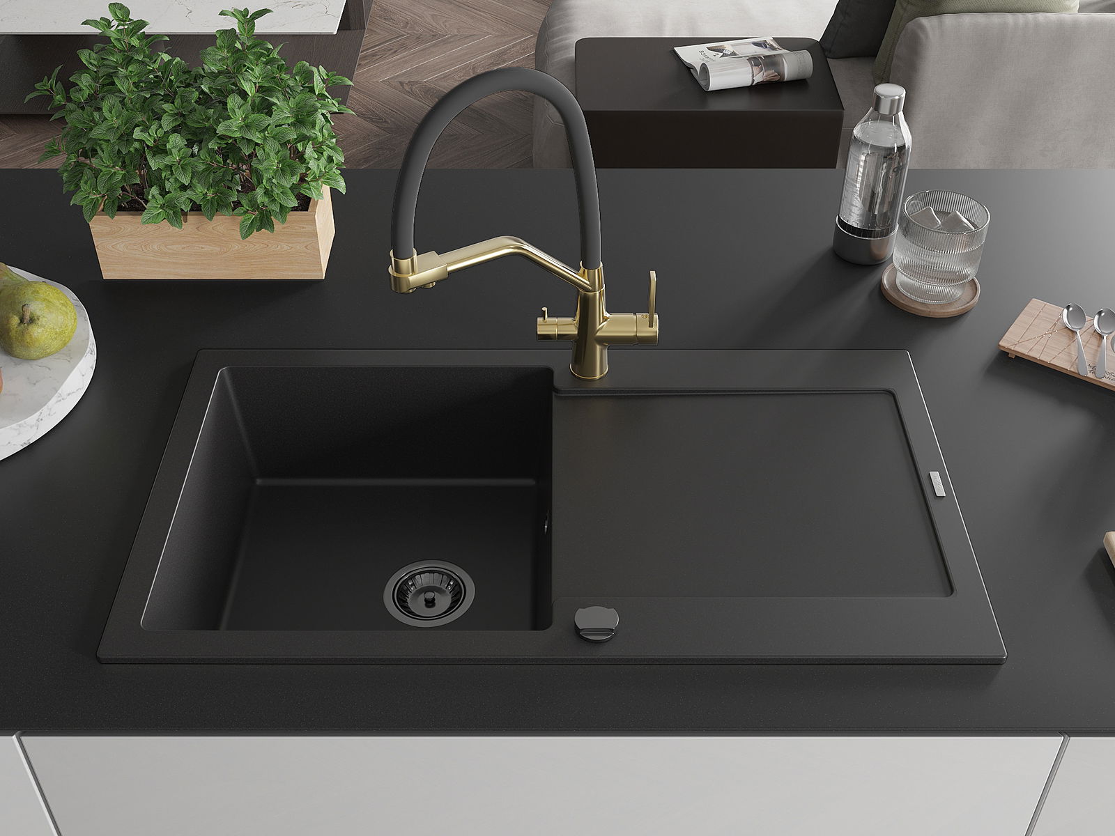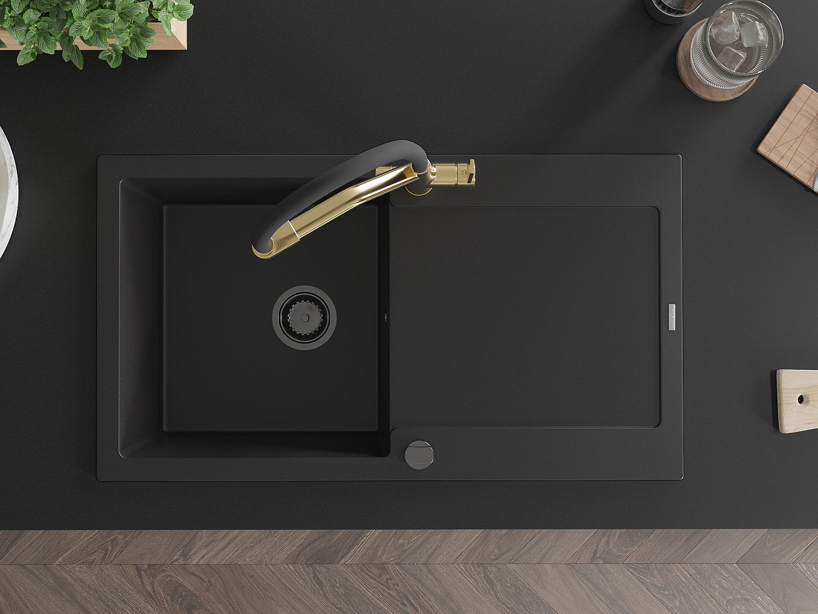 Mexen Leo gránit mosogató 1-medencés csepegtetővel és Duo konyhai csapteleppel, fekete - 6501-77-671701-57-B