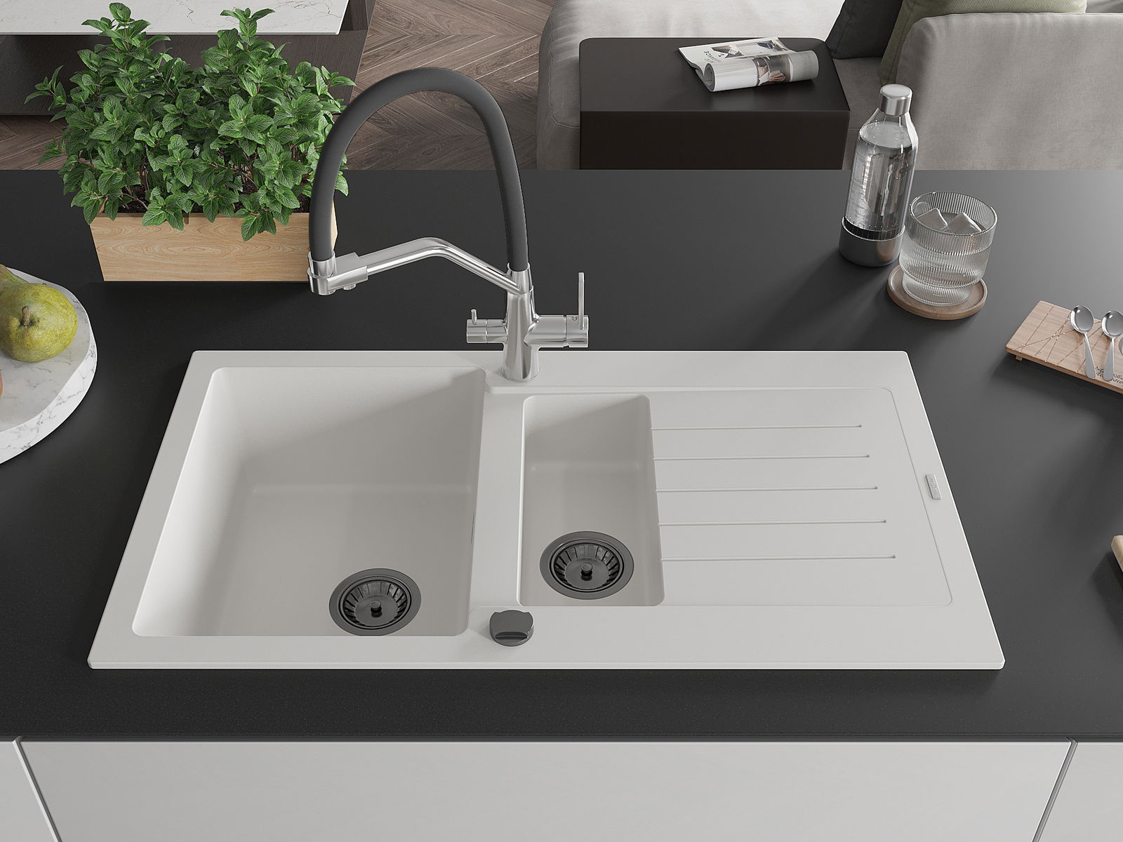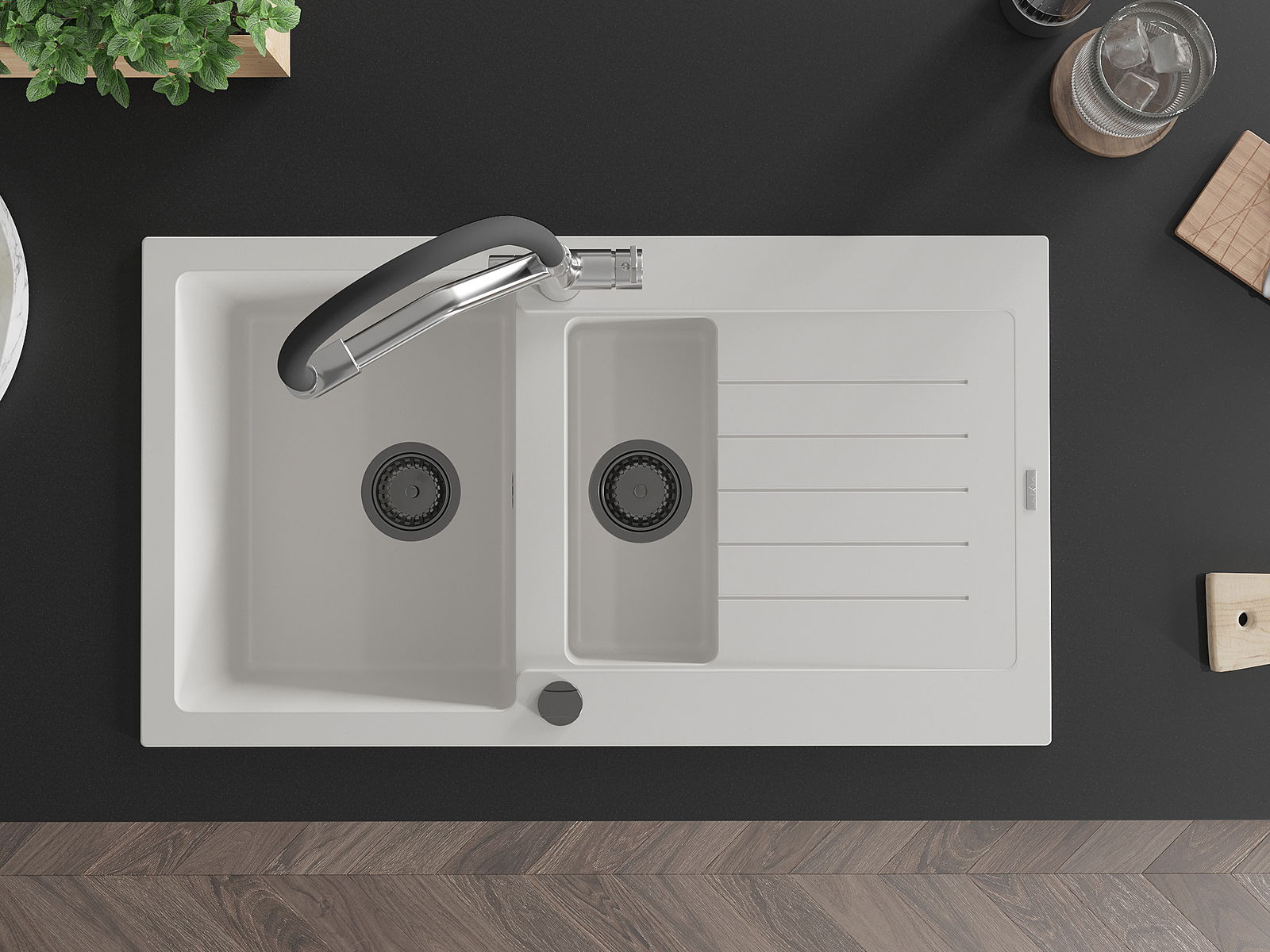 Mexen Matias 1,5-medencés gránit mosogató csepegtetővel és Duo konyhai csapteleppel, fehér - 6502-20-671701-07-B