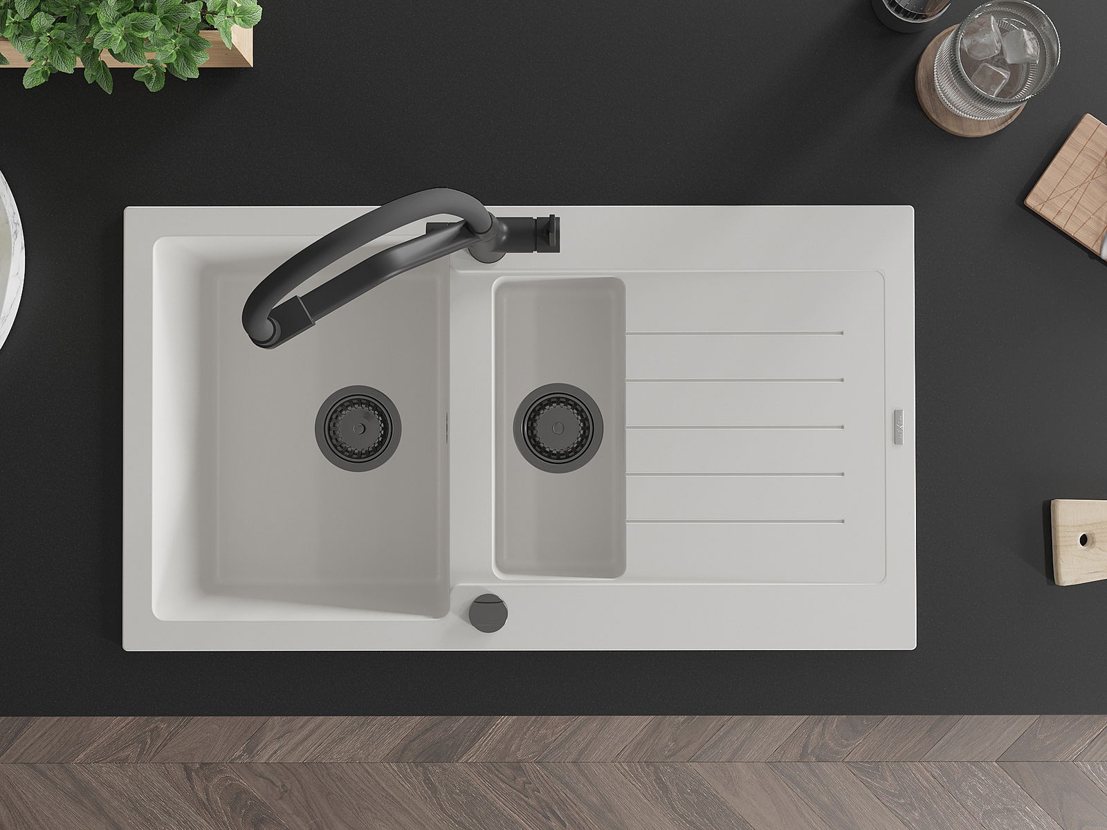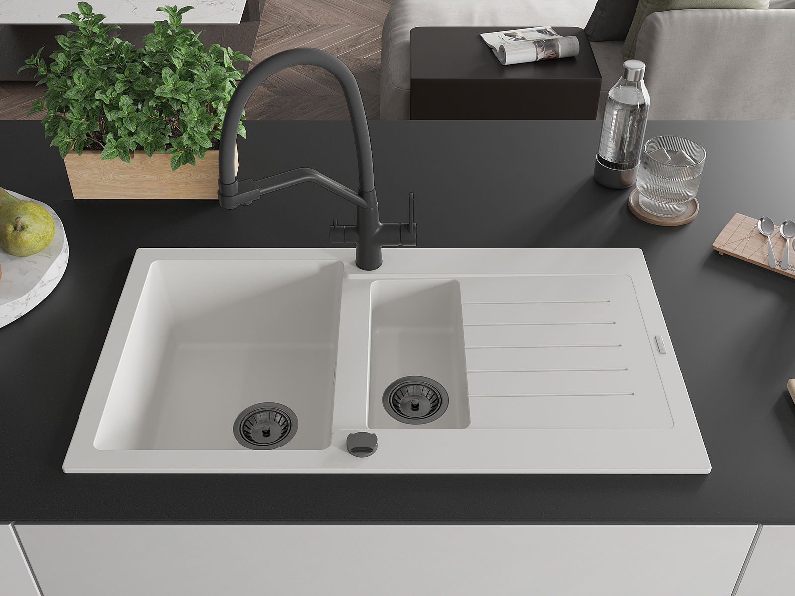 A mosogató magas minőségű gránitból készült. Elegáns, de mindenekelőtt praktikus kiegészítője minden konyhának, függetlenül annak stílusától. A gránit magas minősége és tartóssága hosszú távú használatot biztosít.