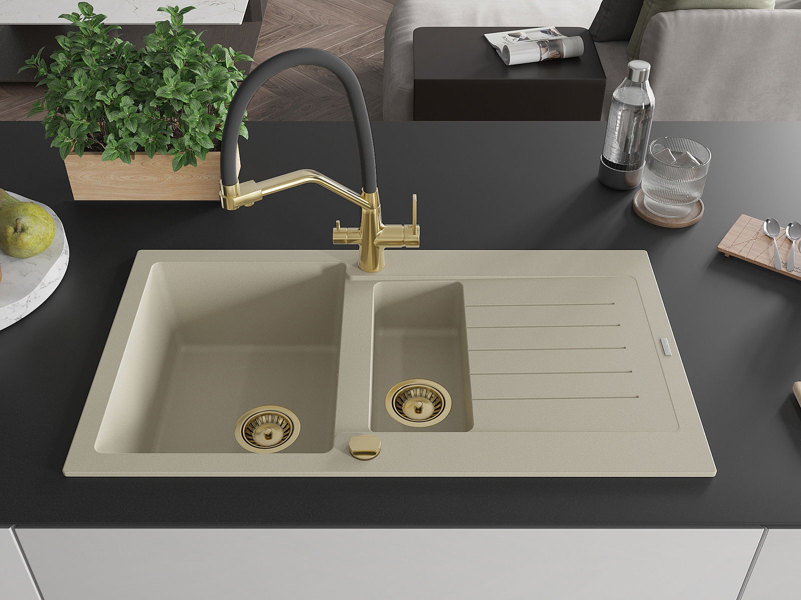 Mexen Matias 1,5 rekeszes gránit mosogató csepegtetővel és Duo konyhai csapteleppel, bézs - 6502-69-671701-57-G