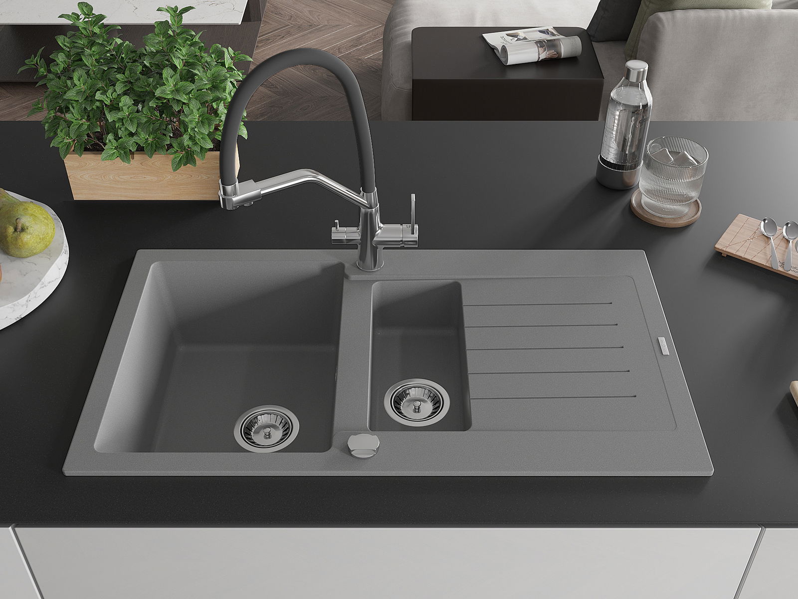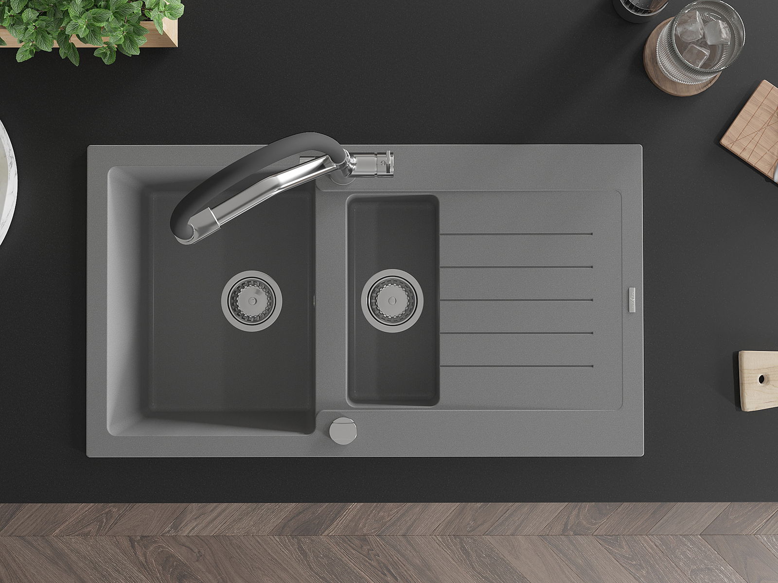 A mosogató kiváló minőségű gránitból készül. Ez egy elegáns és mindenekelőtt minden konyhához praktikus kiegészítés, stílusától függetlenül. A kiváló minőségű és a gránit tartósság biztosítja a sok éves használatát.