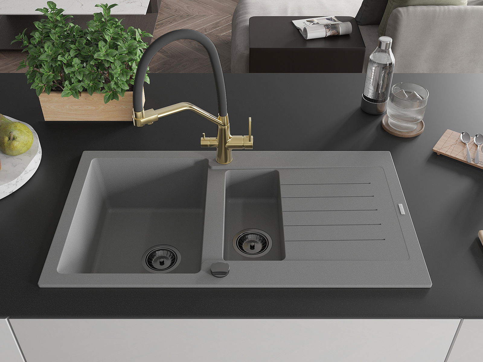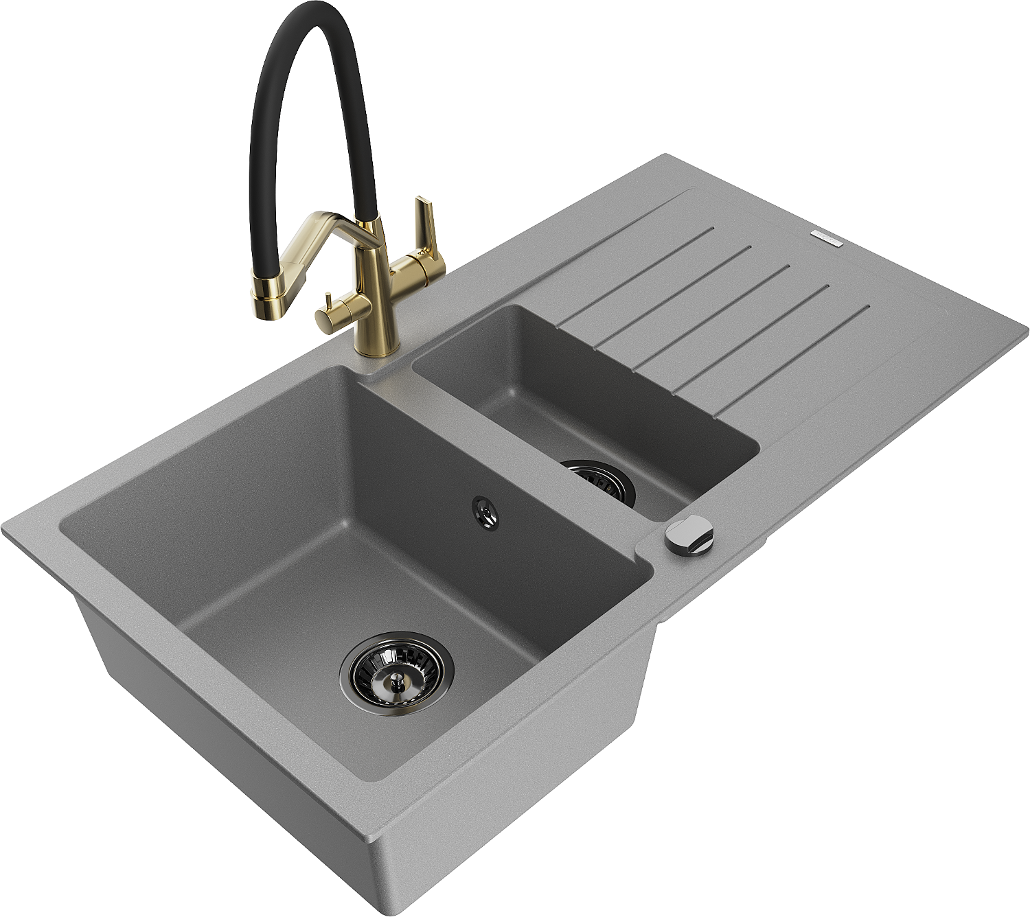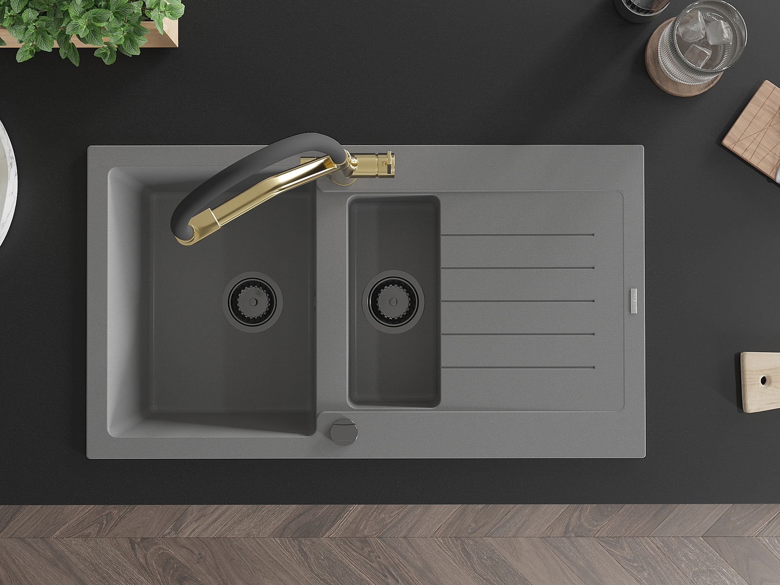 Mexen Matias 1,5 rekeszes gránit mosogató csepptálcával és Duo konyhai csapteleppel, szürke - 6502-71-671701-57-B