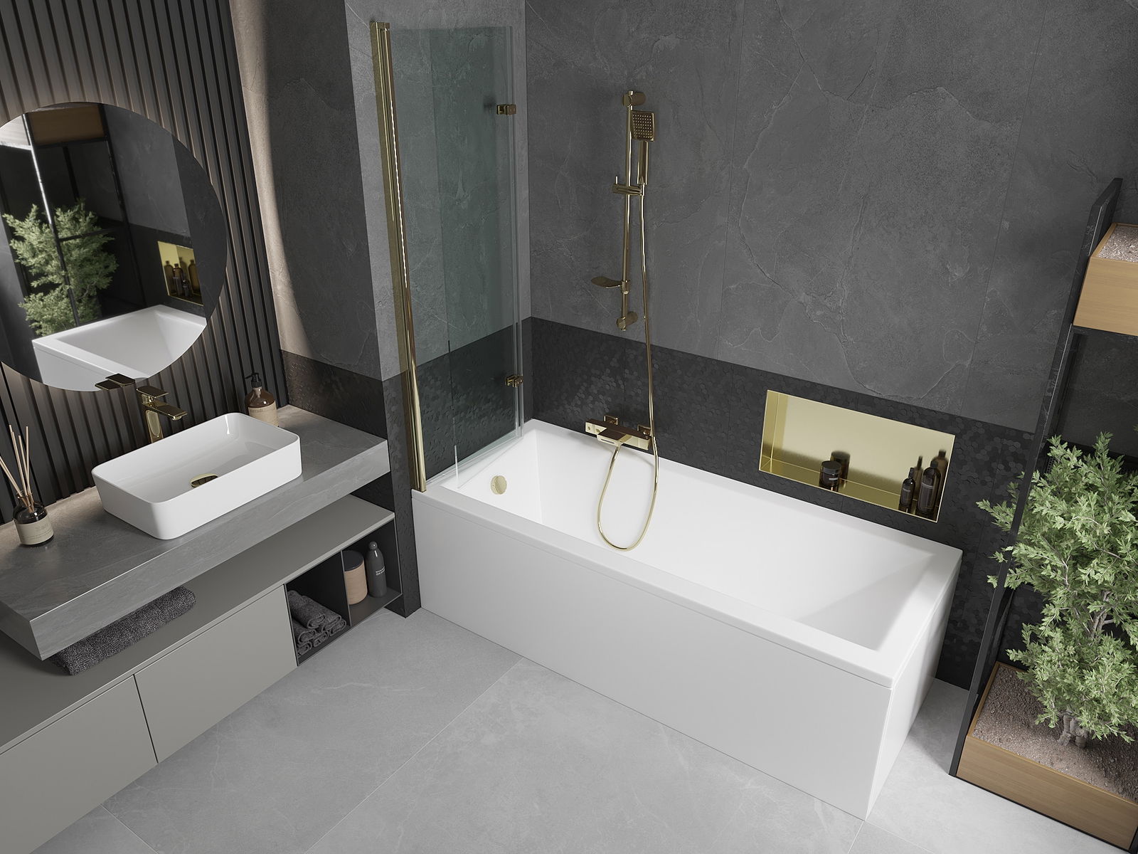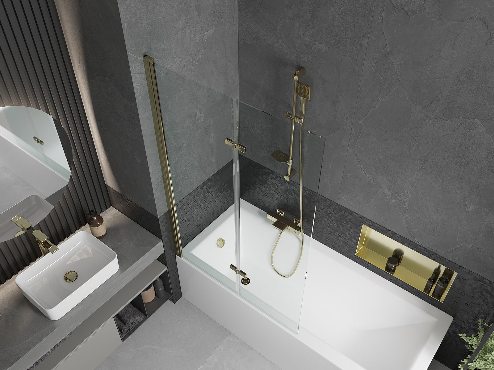 A képernyő két szárnyból készül, a hajtás lehetőségével. Ez a megoldás több helyet takarít meg a fürdőszobában, és lehetővé teszi a fennmaradó hely szabadon történő használatát, ha nem használjuk a fürdőszobát.