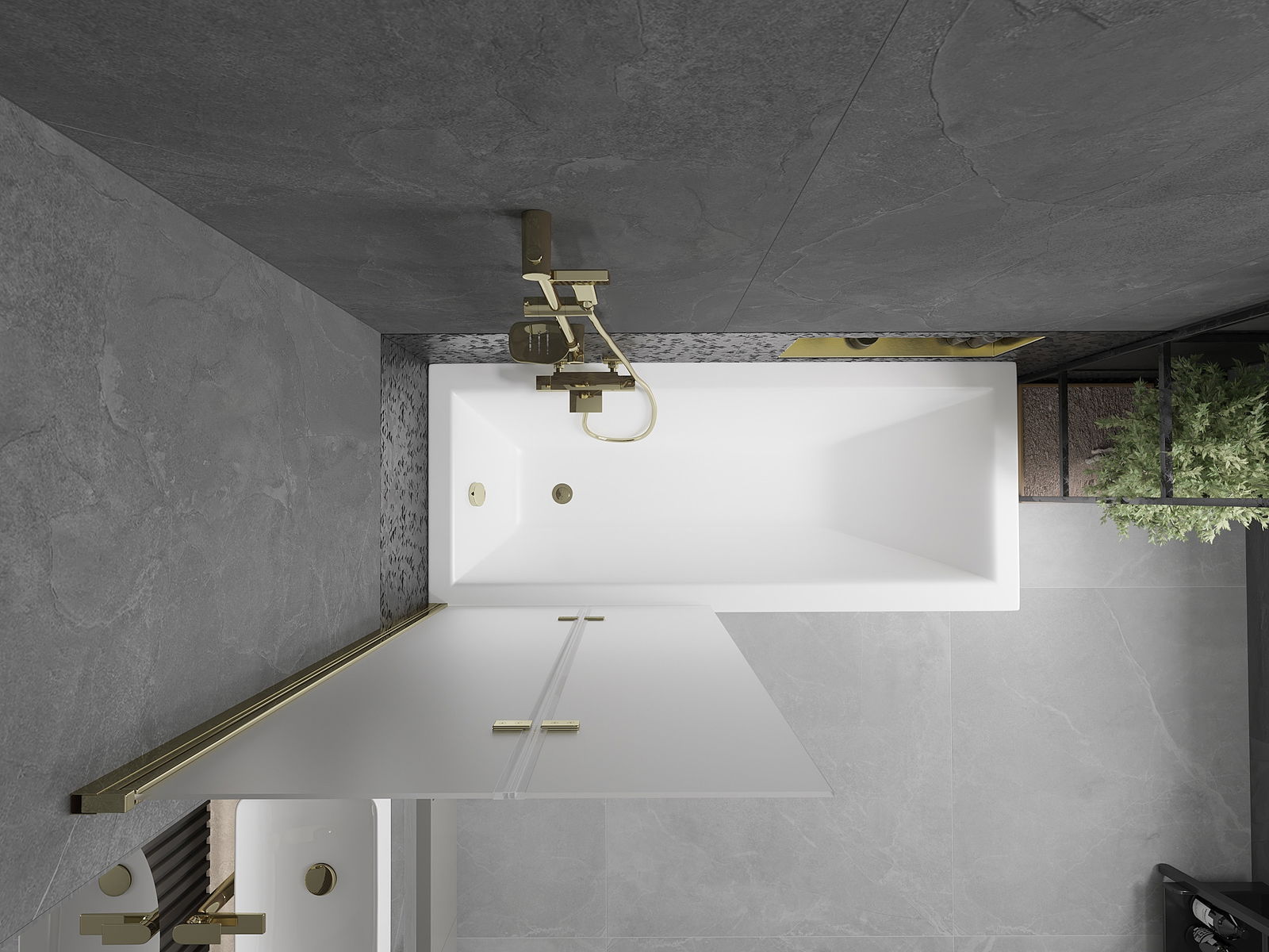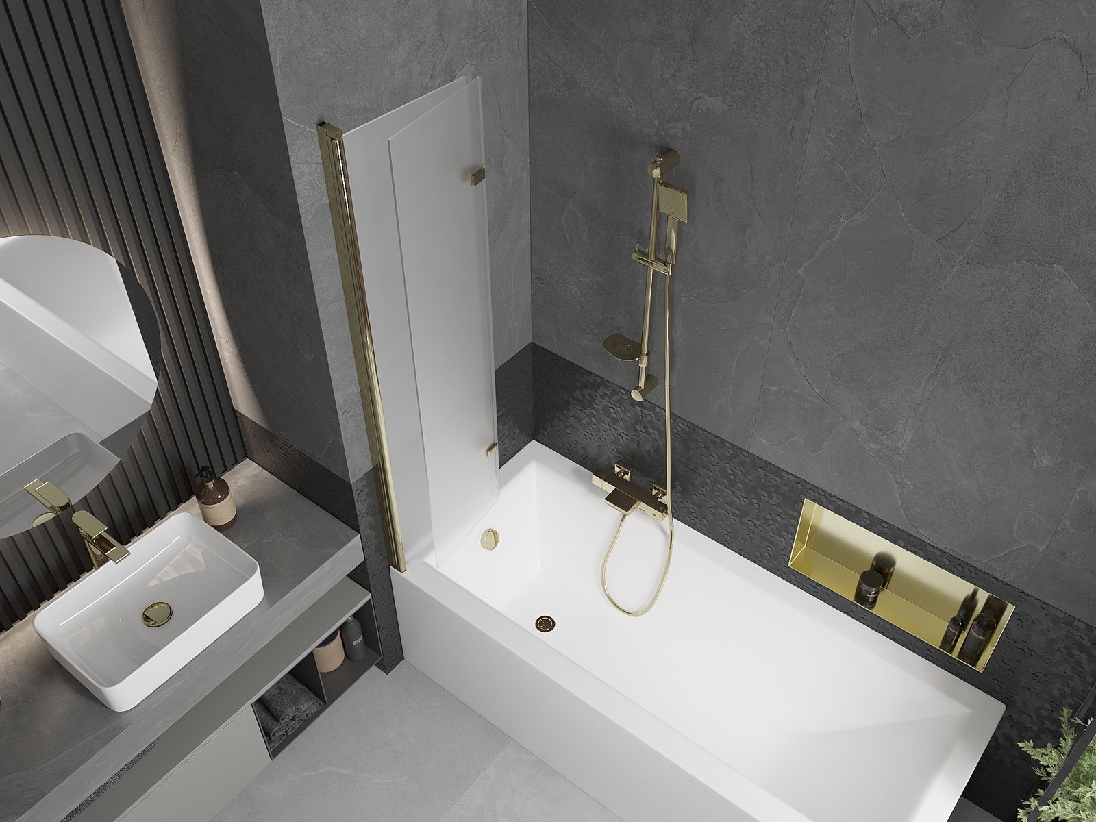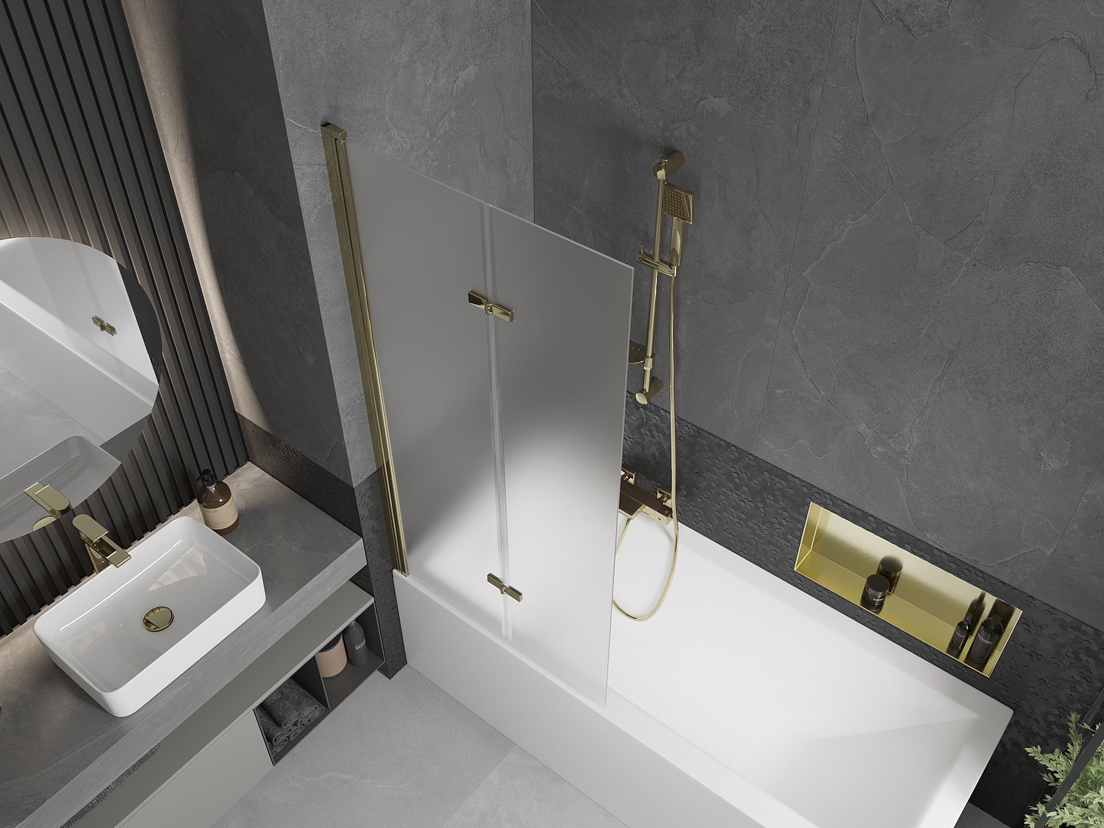 A képernyő két szárnyból készül, a hajtás lehetőségével. Ez a megoldás több helyet takarít meg a fürdőszobában, és lehetővé teszi a fennmaradó hely szabadon történő használatát, ha nem használjuk a fürdőszobát.