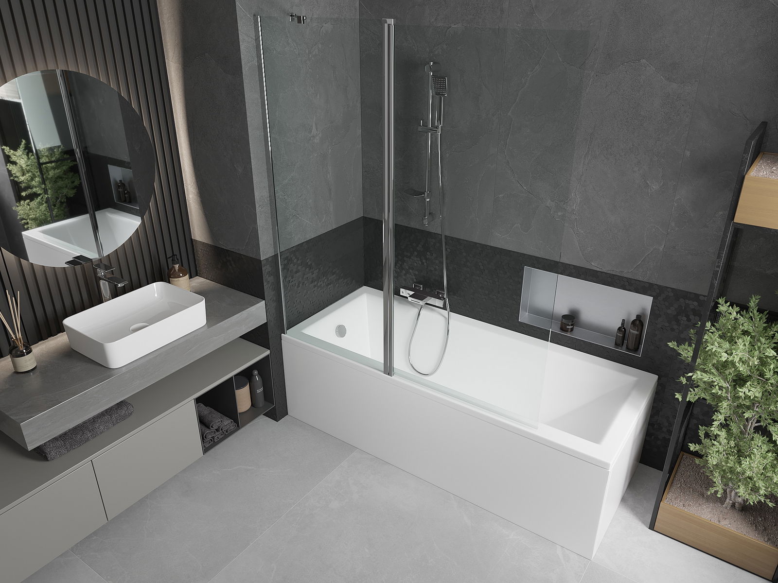 A képernyőnek egy mozgó szárnya van, a hajtogatás lehetőségével. Ez a megoldás több helyet takarít meg a fürdőszobában, és lehetővé teszi a fennmaradó hely szabadon történő használatát, ha nem használjuk a fürdőszobát.