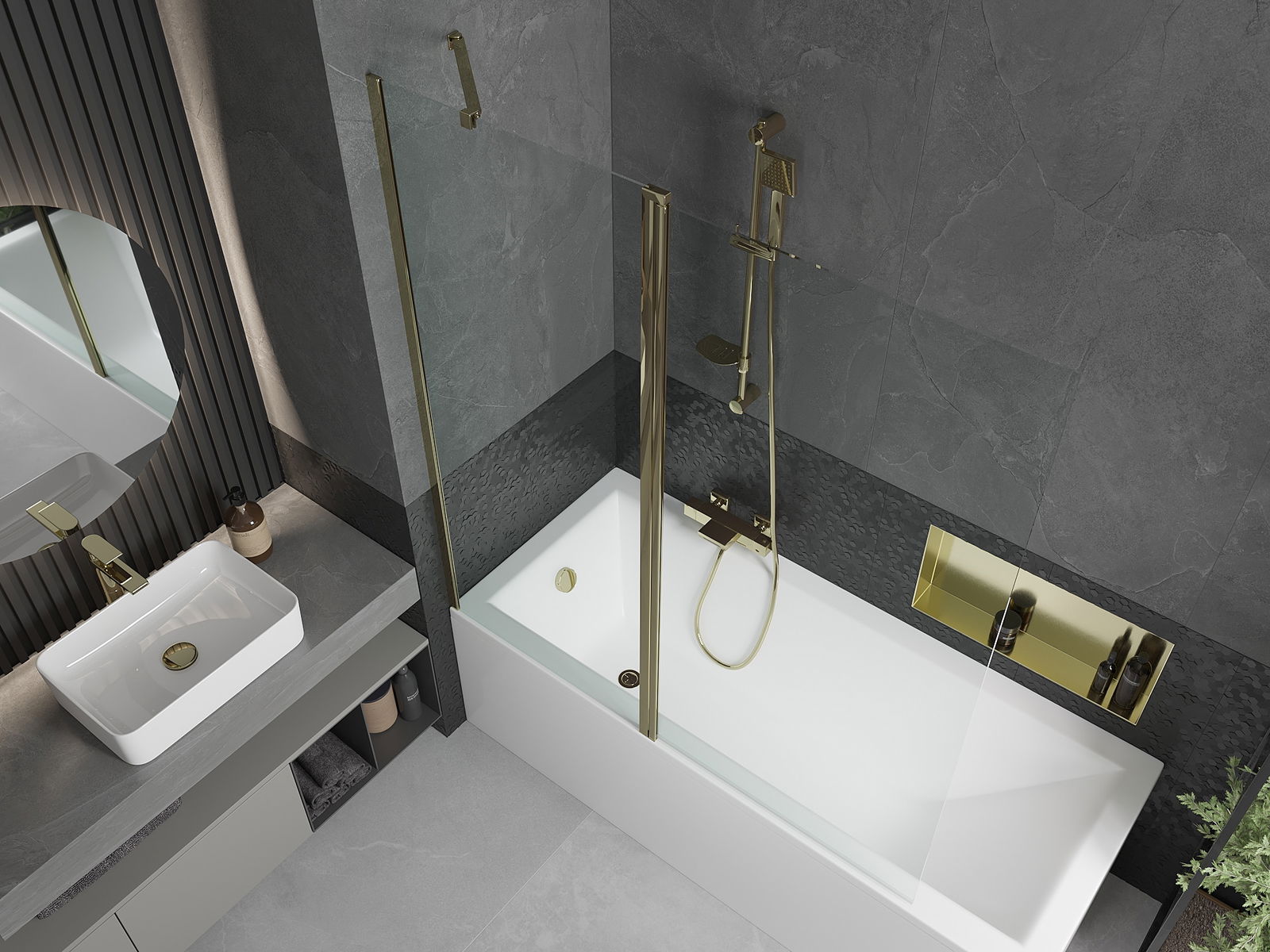 A képernyőnek egy mozgó szárnya van, a hajtogatás lehetőségével. Ez a megoldás több helyet takarít meg a fürdőszobában, és lehetővé teszi a fennmaradó hely szabadon történő használatát, ha nem használjuk a fürdőszobát.