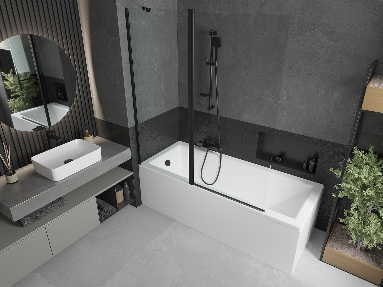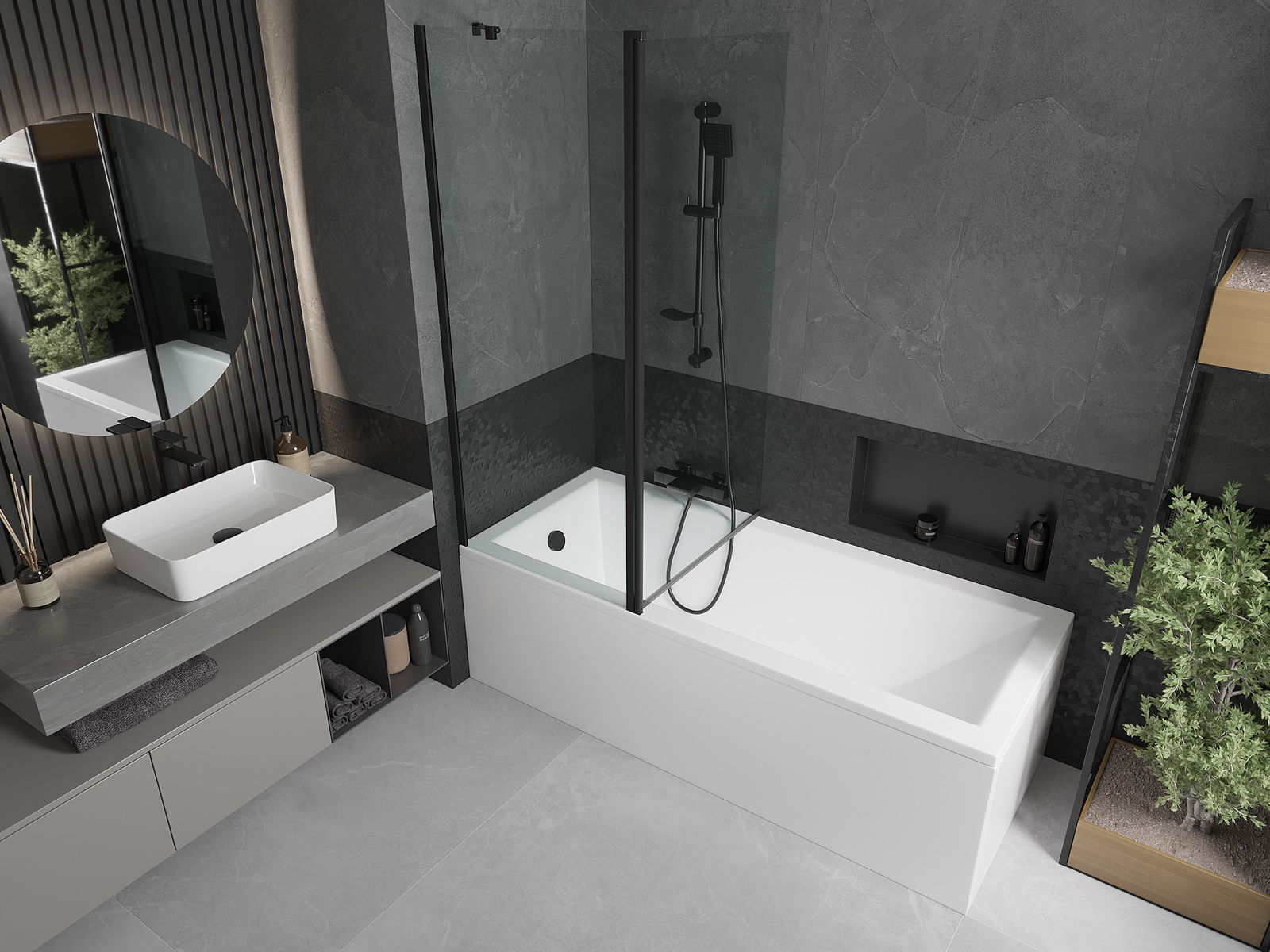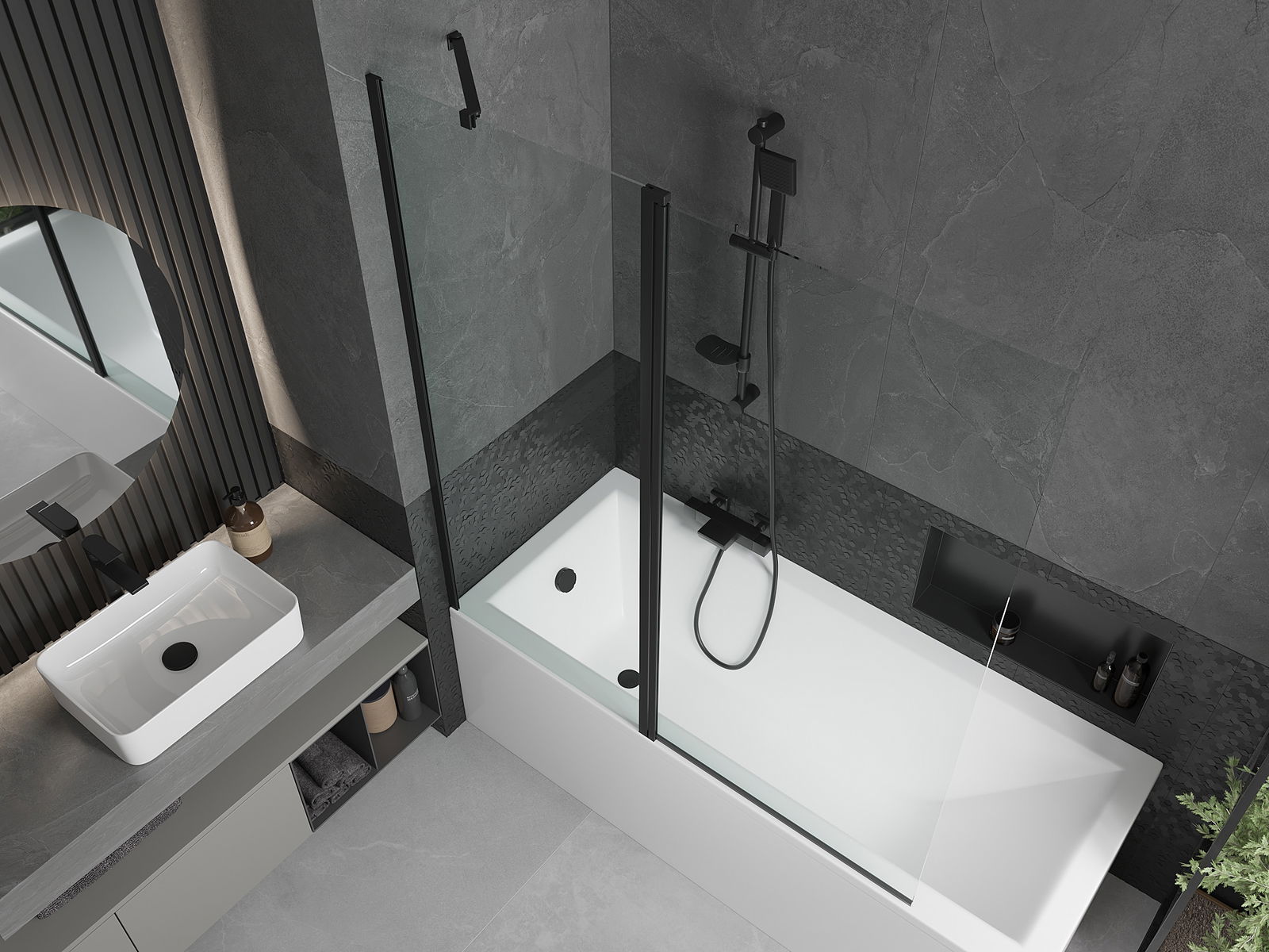 A képernyőnek egy mozgó szárnya van, a hajtogatás lehetőségével. Ez a megoldás több helyet takarít meg a fürdőszobában, és lehetővé teszi a fennmaradó hely szabadon történő használatát, ha nem használjuk a fürdőszobát.