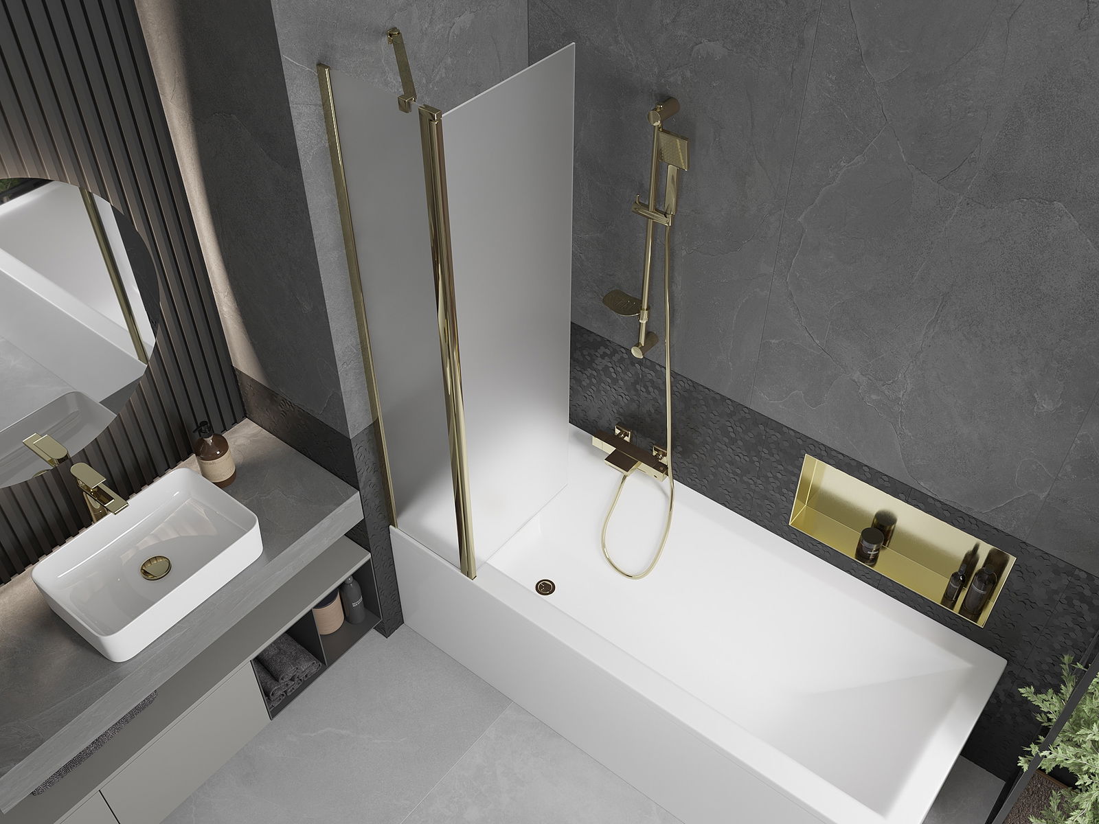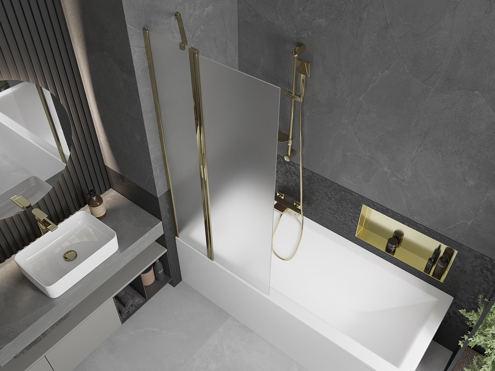 A képernyőnek egy mozgó szárnya van, a hajtogatás lehetőségével. Ez a megoldás több helyet takarít meg a fürdőszobában, és lehetővé teszi a fennmaradó hely szabadon történő használatát, ha nem használjuk a fürdőszobát.