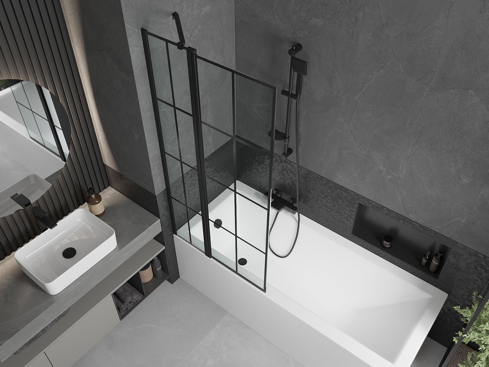 A paraván egy mozgatható szárnnyal rendelkezik, ami összecsukható. Ez a megoldás lehetővé teszi, hogy több helyet spóroljunk meg a fürdőszobában, és szabadon használhassuk a fennmaradó teret, amikor nem használjuk a fürdési zónát.