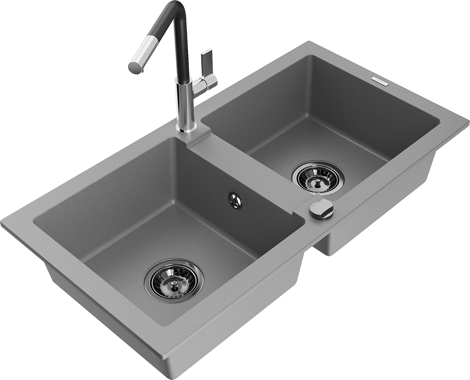 Mexen Mario kettős gránit mosogató Flora konyhai csappal, szürke - 6504-71-670401-07-B