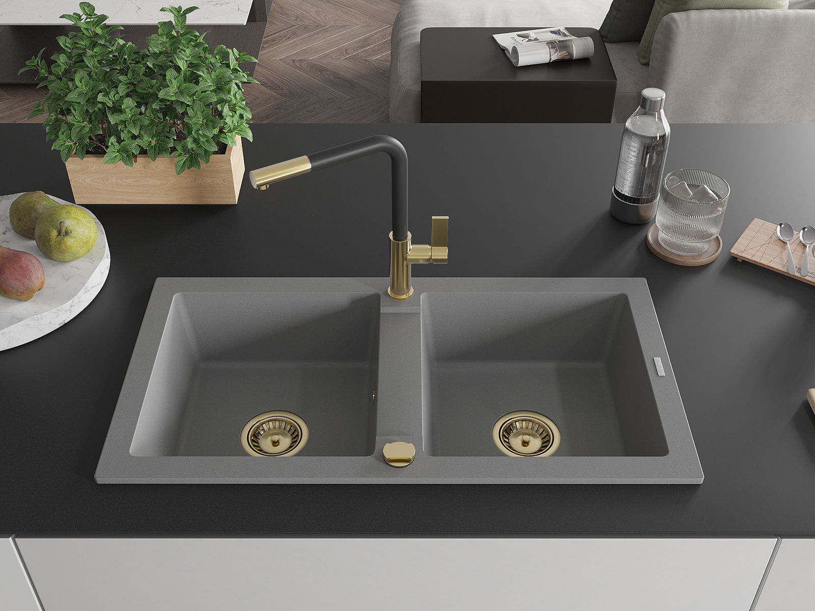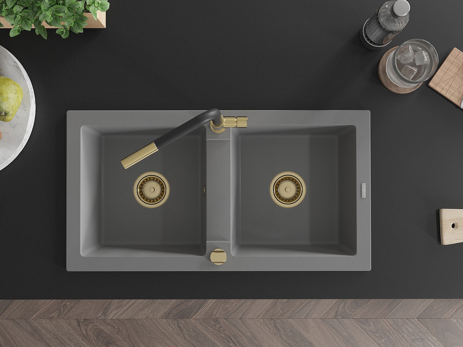 Mexen Mario 2 rekeszes gránit mosogató Flora konyhai csapteleppel, szürke - 6504-71-670401-57-G