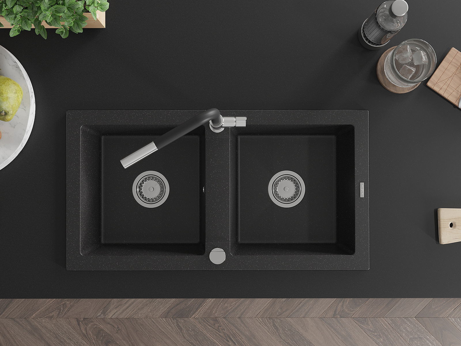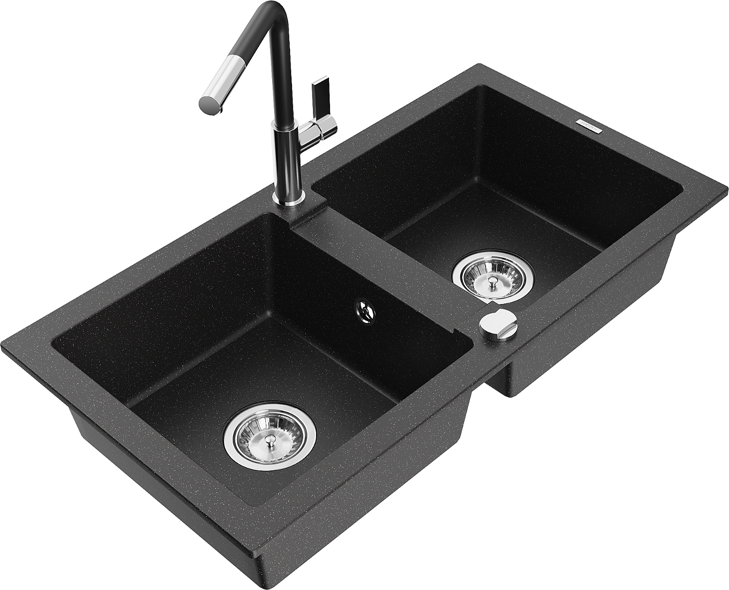 Mexen Mario gránit mosogató 2-medencés konyhai csappal Flora, fekete/ezüst metál - 6504-73-670401-07