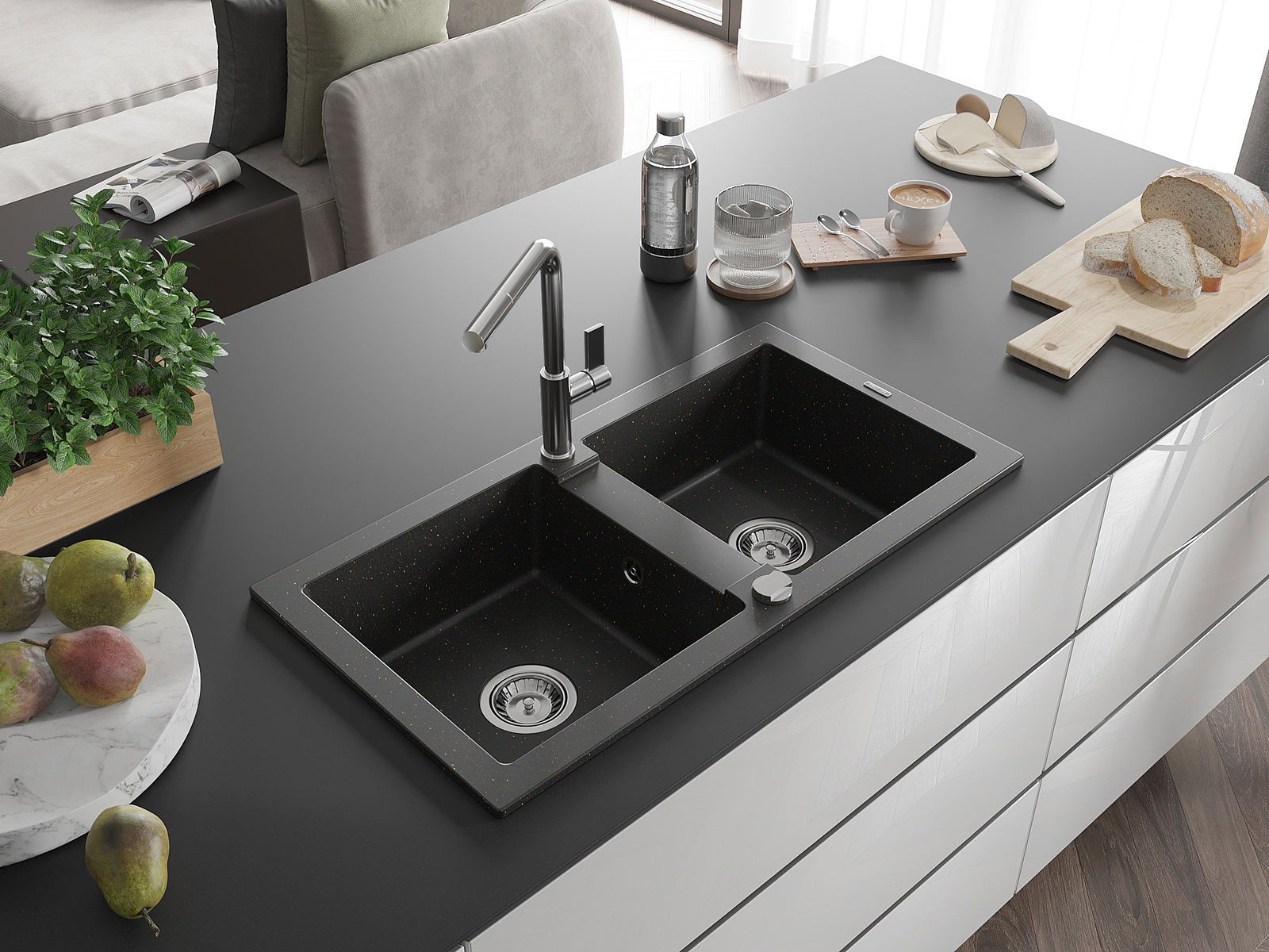 Mexen Mario gránit mosogató, 2-medencés konyhai csapteleppel Flora, fekete/arany metálszín - 6504-75-670401-00
