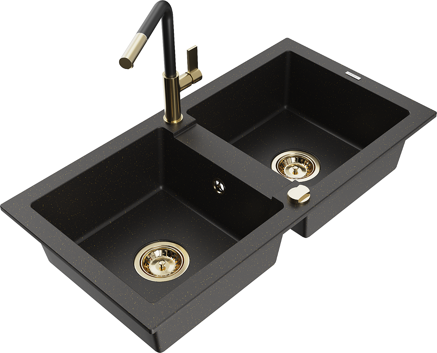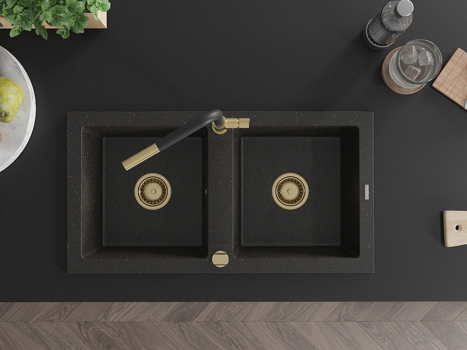 Mexen Mario gránit kétmedencés mosogató Flora konyhai csapteleppel, fekete/arany metál - 6504-75-670401-57-G