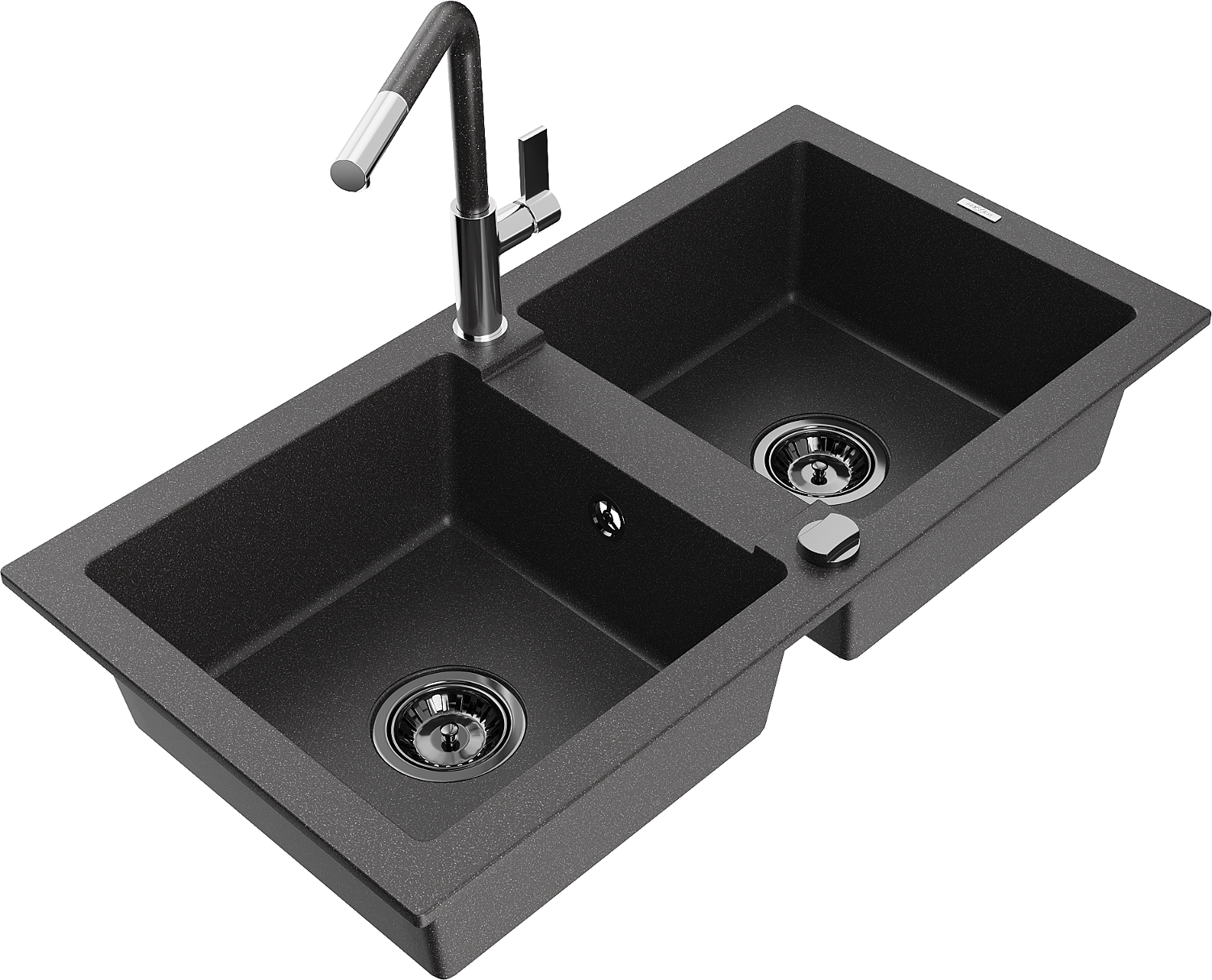 Mexen Mario 2 kamrás gránit mosogató Flora konyhai csapteleppel, fekete pöttyös - 6504-76-670401-08-B