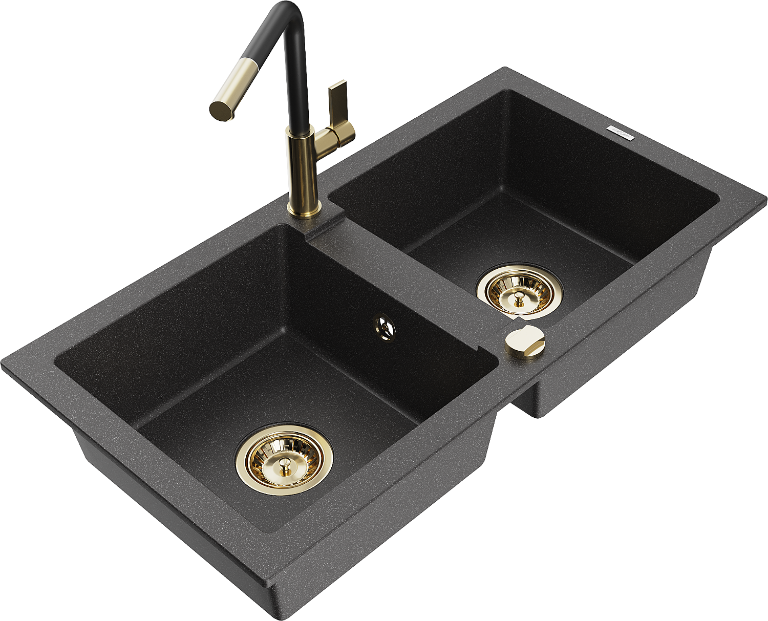 Mexen Mario gránit 2 rekeszes mosogató konyhai csappal Flora, fekete pöttyös - 6504-76-670401-57-G