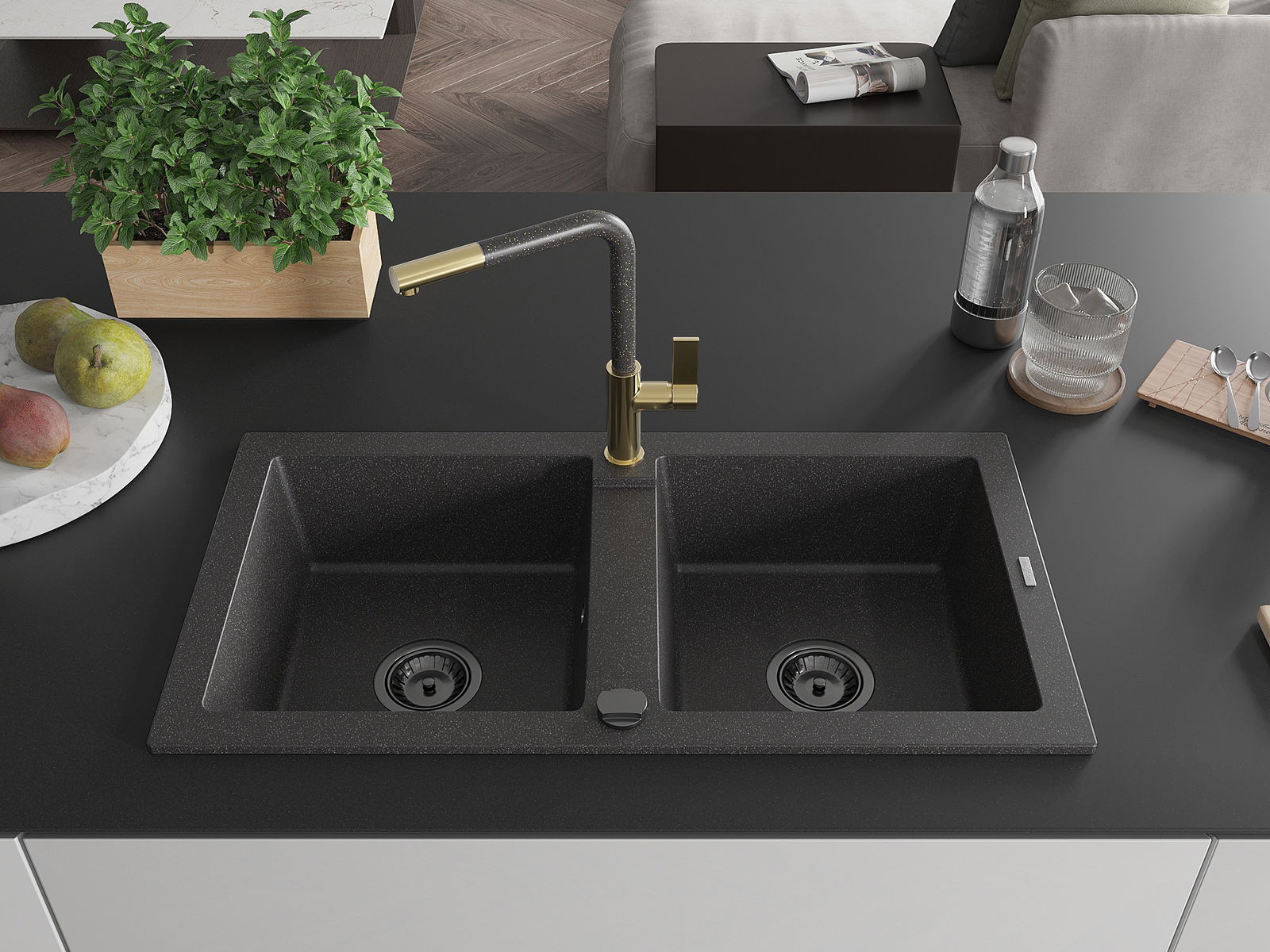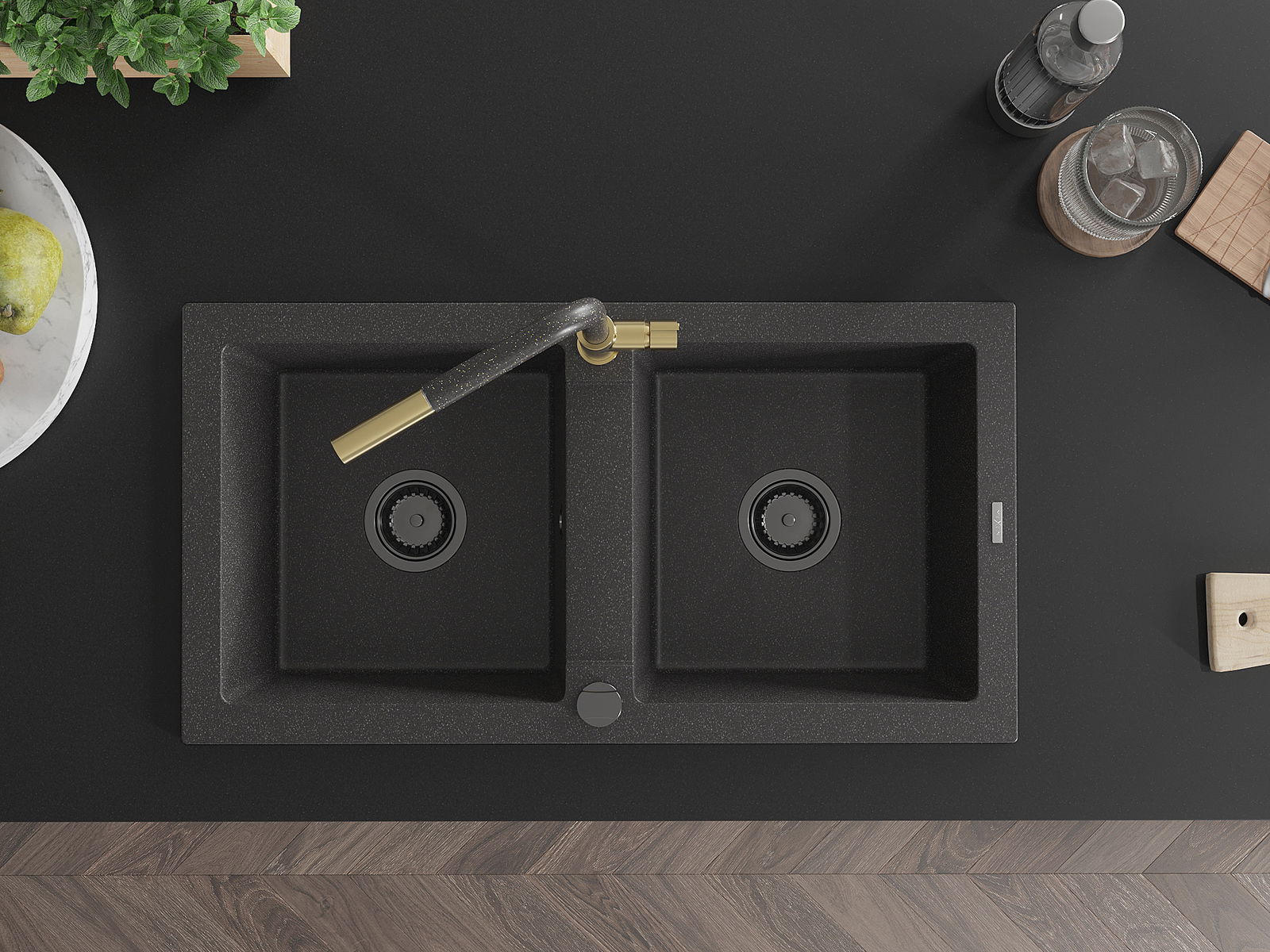 Mexen Mario gránitmosogató 2-medencés konyhai csapteleppel Flora, fekete pöttyös - 6504-76-670401-75-B