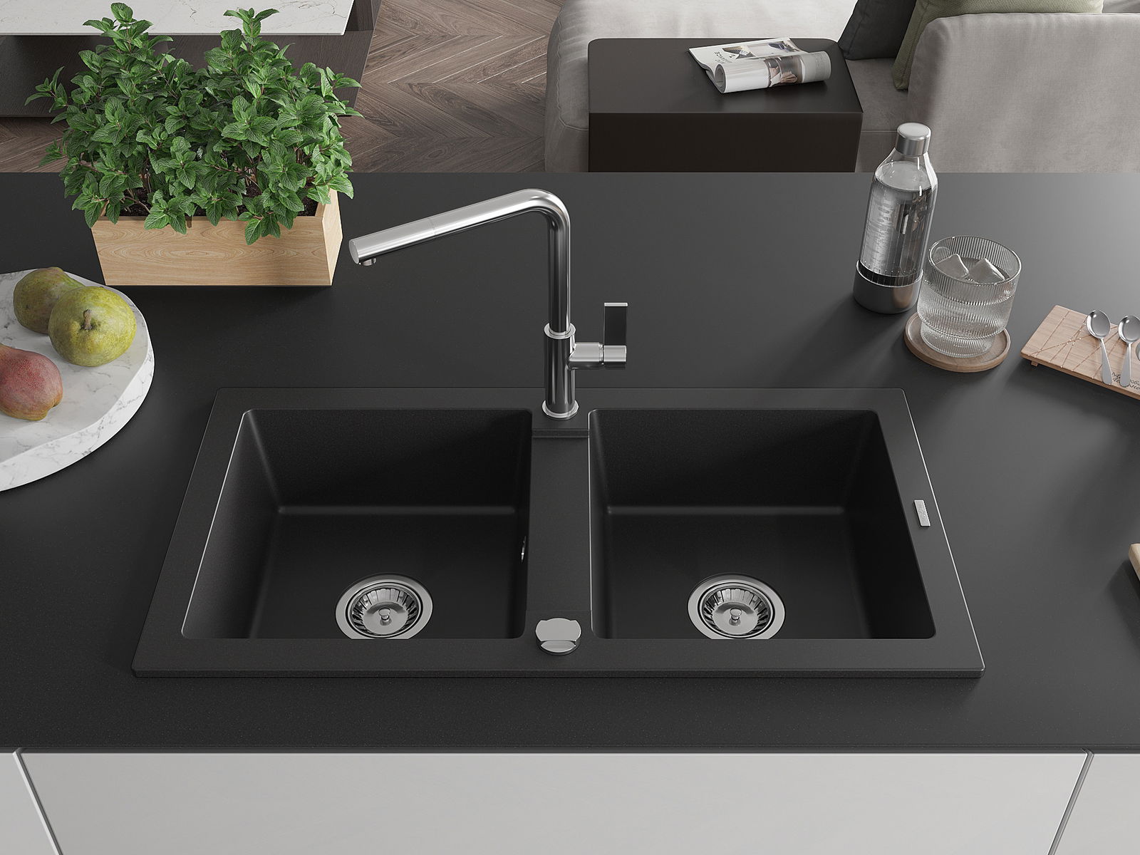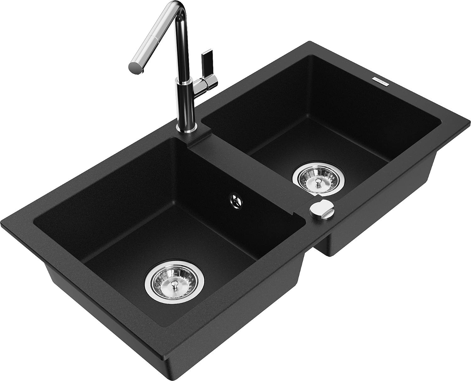 Mexen Mario gránit kétmedencés mosogató Flora konyhai csapteleppel, fekete - 6504-77-670401-00