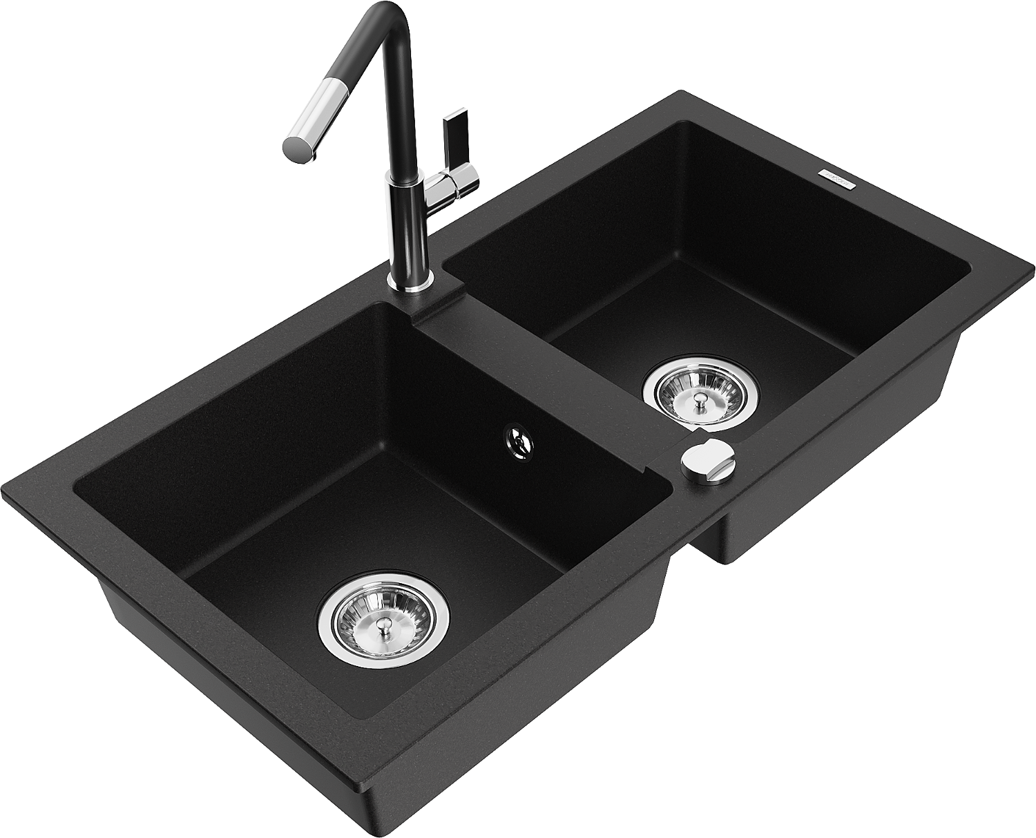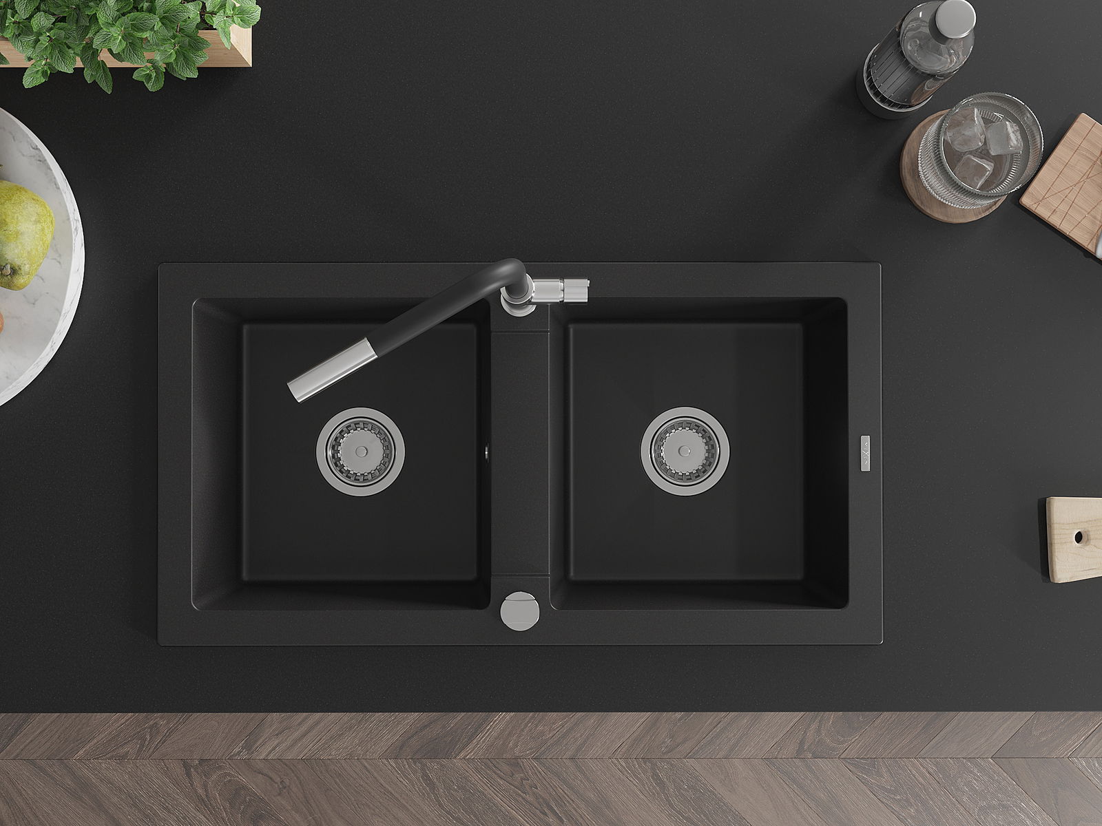 Mexen Mario 2 rekeszes gránit mosogató Flora konyhai csapteleppel, fekete - 6504-77-670401-07