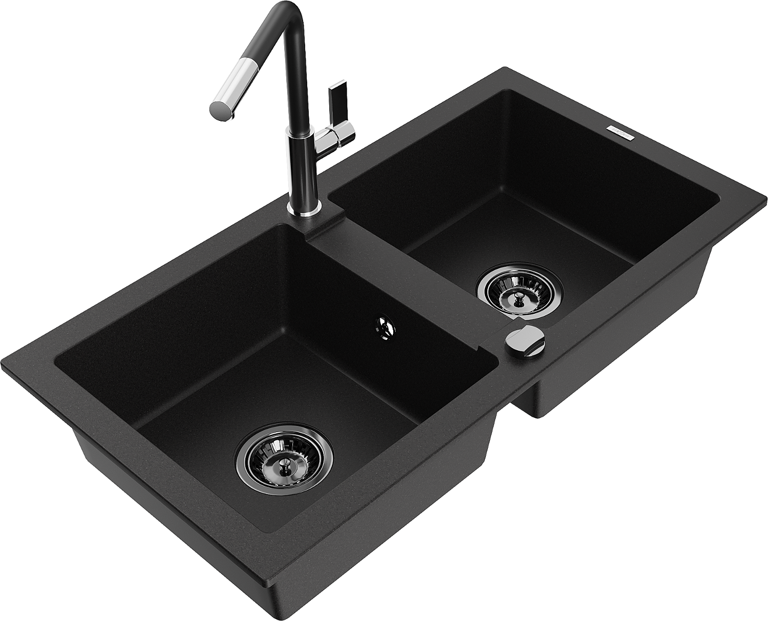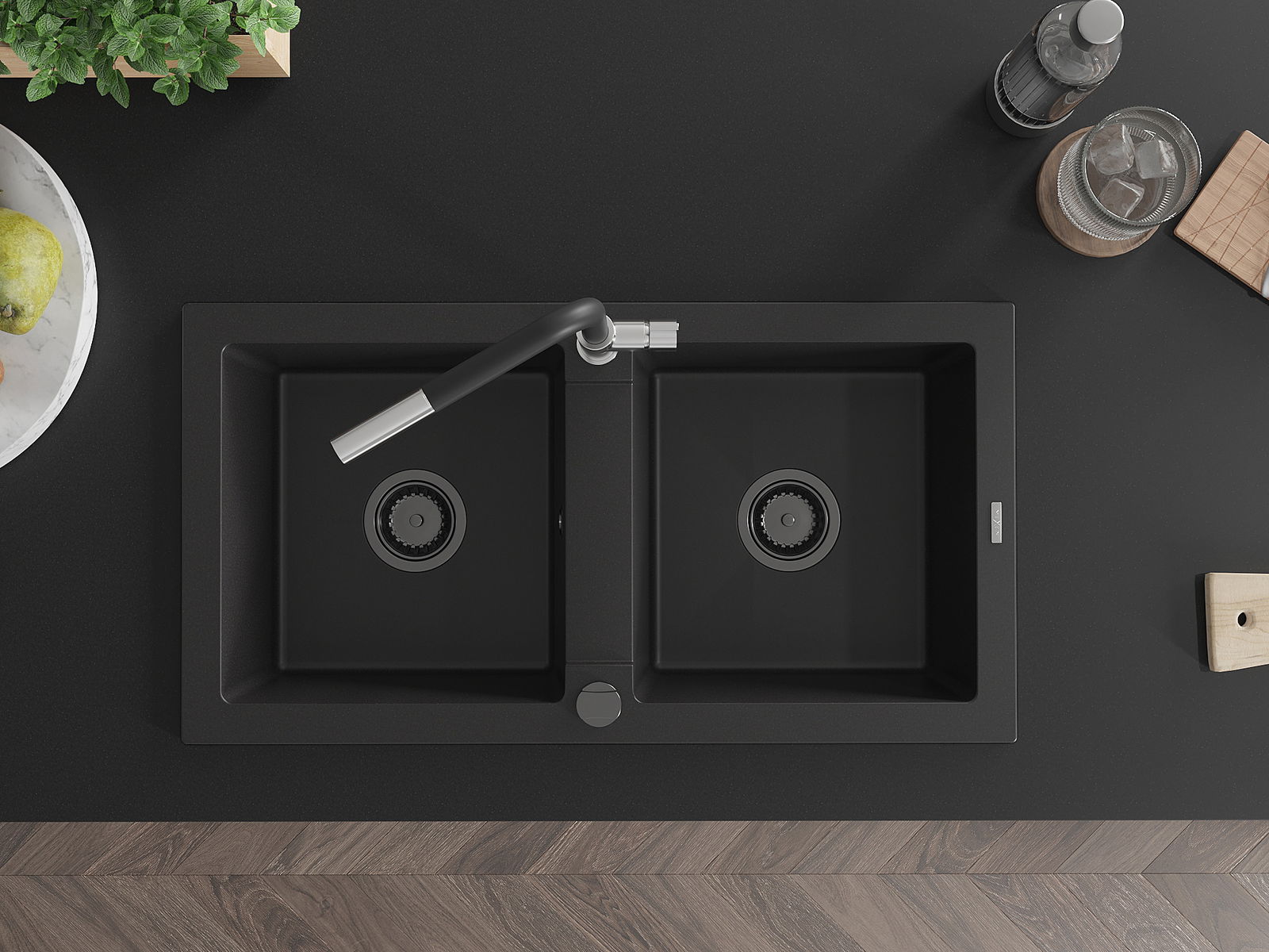 Mexen Mario 2 rekeszes gránit mosogató Flora konyhai csapteleppel, fekete - 6504-77-670401-07-B