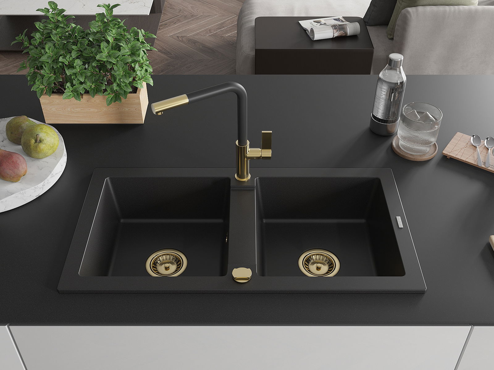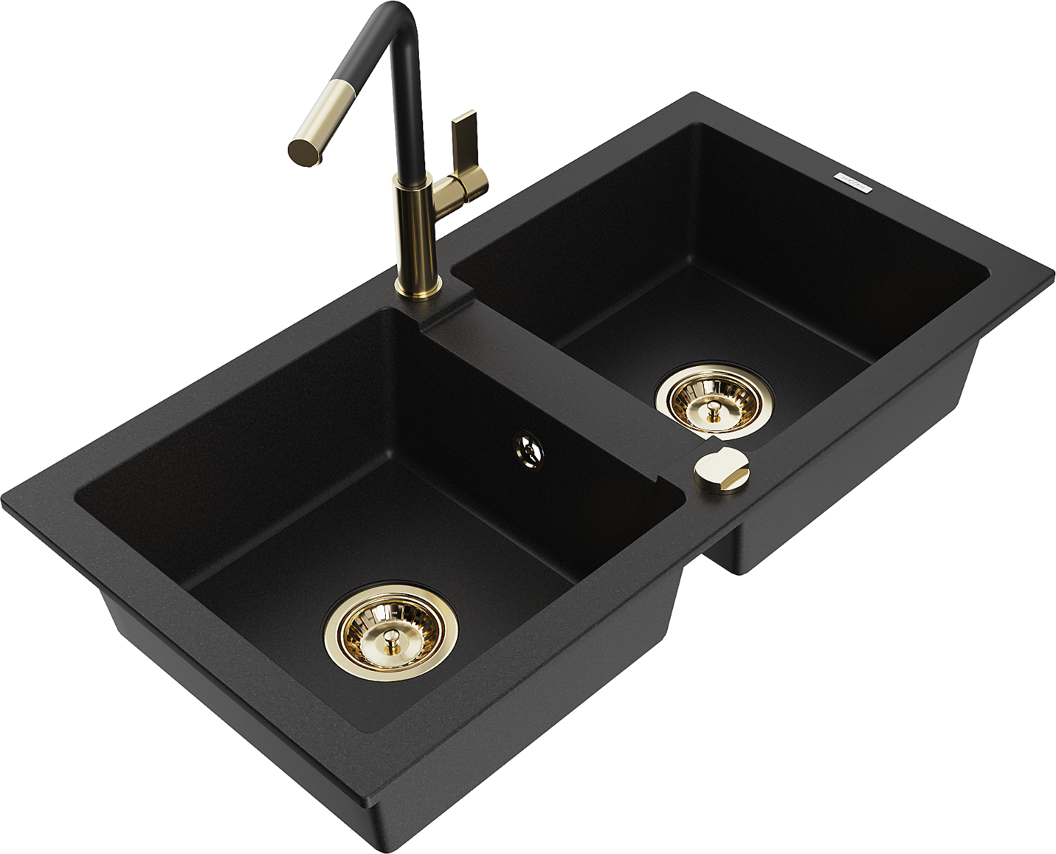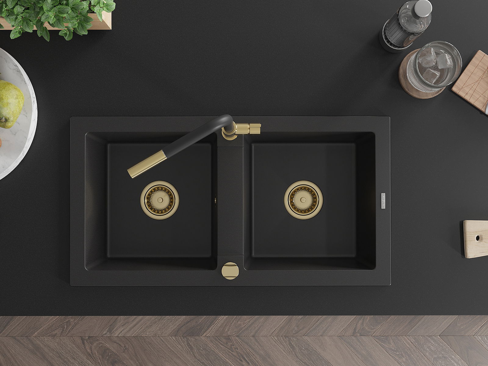 Mexen Mario 2-kamrás gránit mosogató Flora konyhai csapteleppel, fekete - 6504-77-670401-57-G