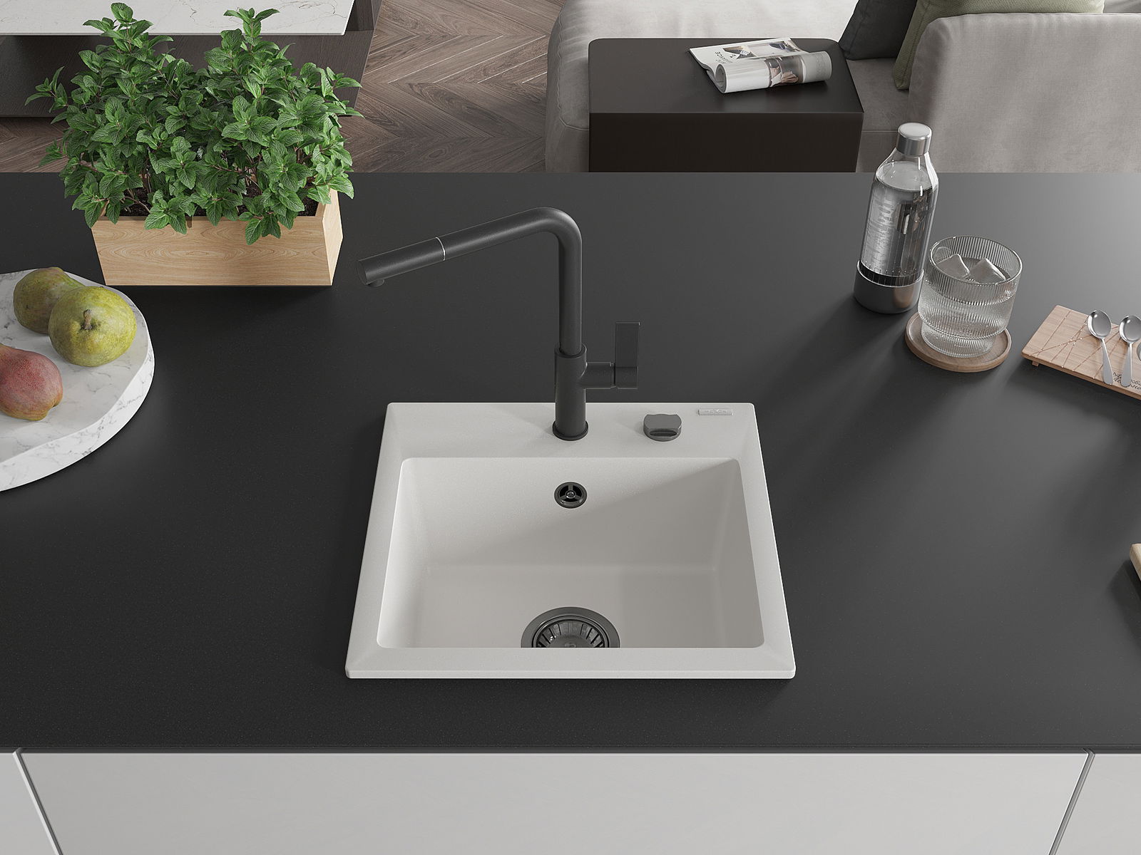 A mosogató kiváló minőségű gránitból készül. Ez egy elegáns és mindenekelőtt minden konyhához praktikus kiegészítés, stílusától függetlenül. A kiváló minőségű és a gránit tartósság biztosítja a sok éves használatát.