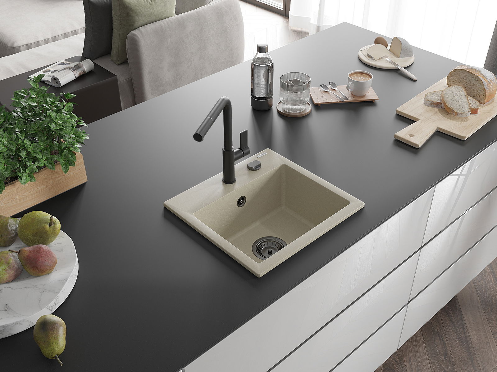 A mosogató kiváló minőségű gránitból készül. Ez egy elegáns és mindenekelőtt minden konyhához praktikus kiegészítés, stílusától függetlenül. A kiváló minőségű és a gránit tartósság biztosítja a sok éves használatát.