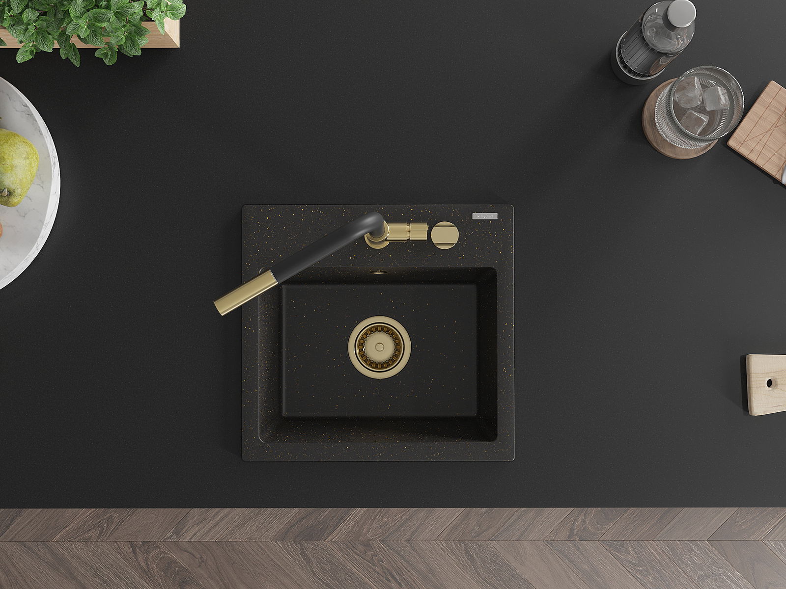 Mexen Milo egymedencés gránit mosogató Flora konyhai csapteleppel, fekete/arany metál - 6505-75-670401-57-G