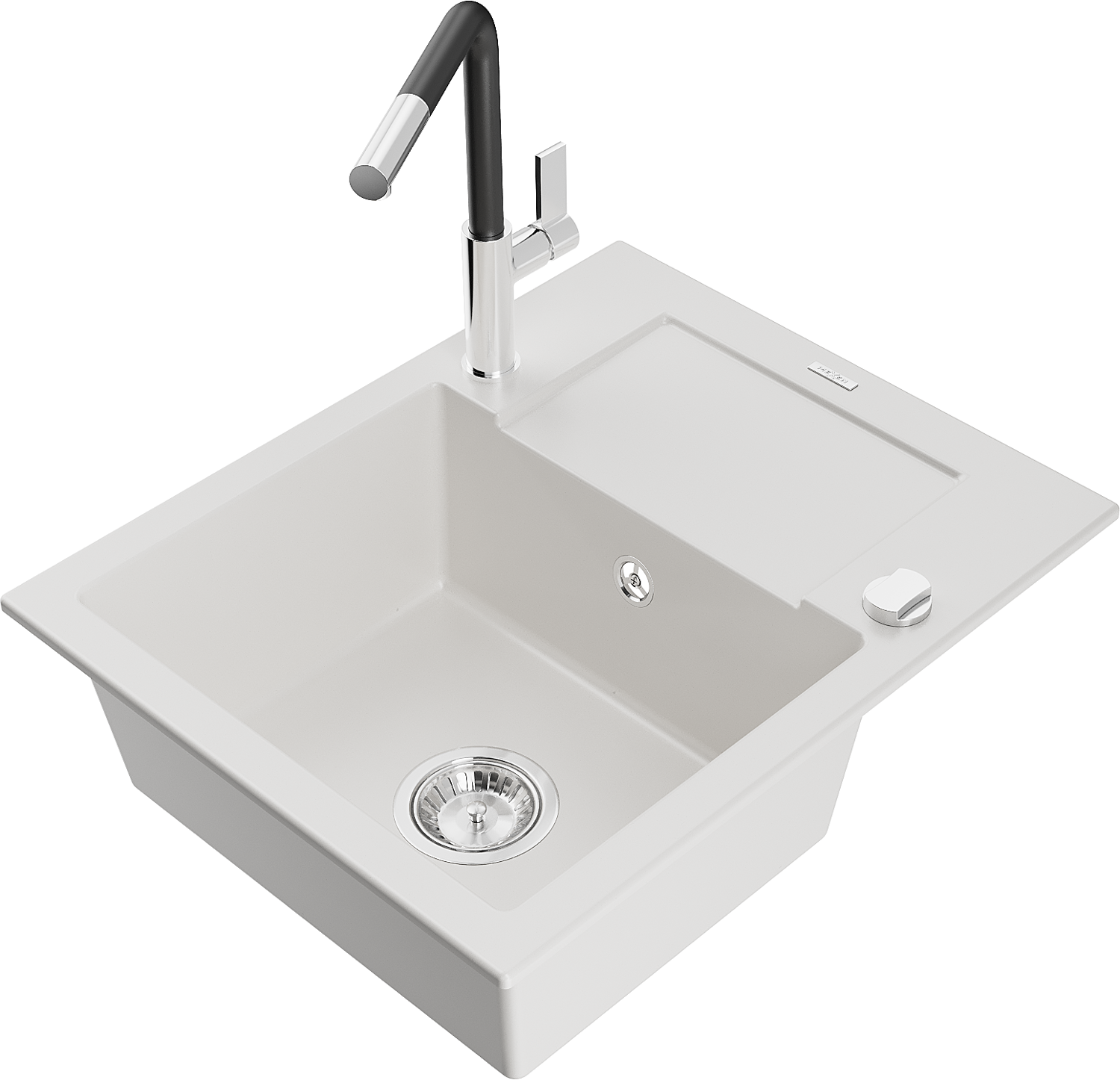 Mexen Enzo gránit mosogatótálca 1-medencés csepegtetővel és Flora konyhai csappal, fehér - 6506-20-670401-07