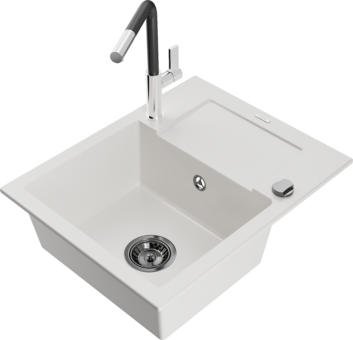 Mexen Enzo 1-medencés gránit mosogatótálca csöpögtetővel és Flora konyhai csapteleppel, fehér - 6506-20-670401-07-B