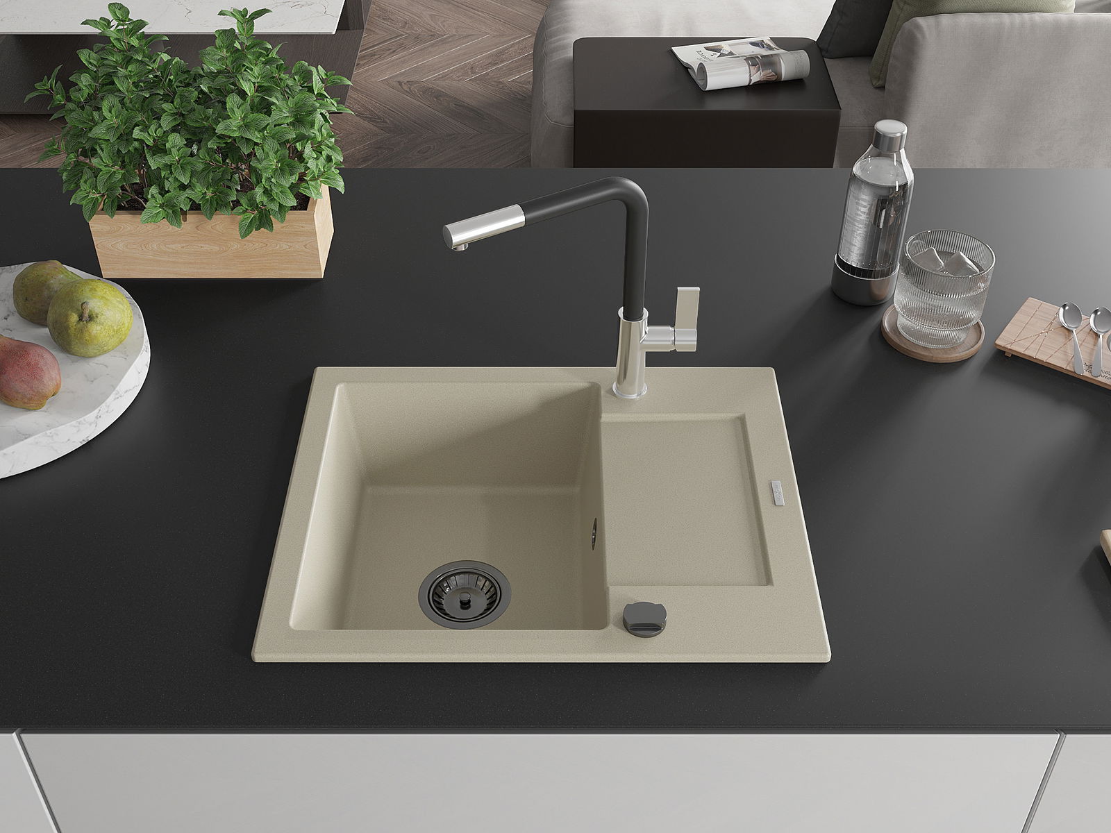 Mexen Enzo egykamrás gránit mosogató csepegtetővel és Flora konyhai csapteleppel, bézs - 6506-69-670401-07-B