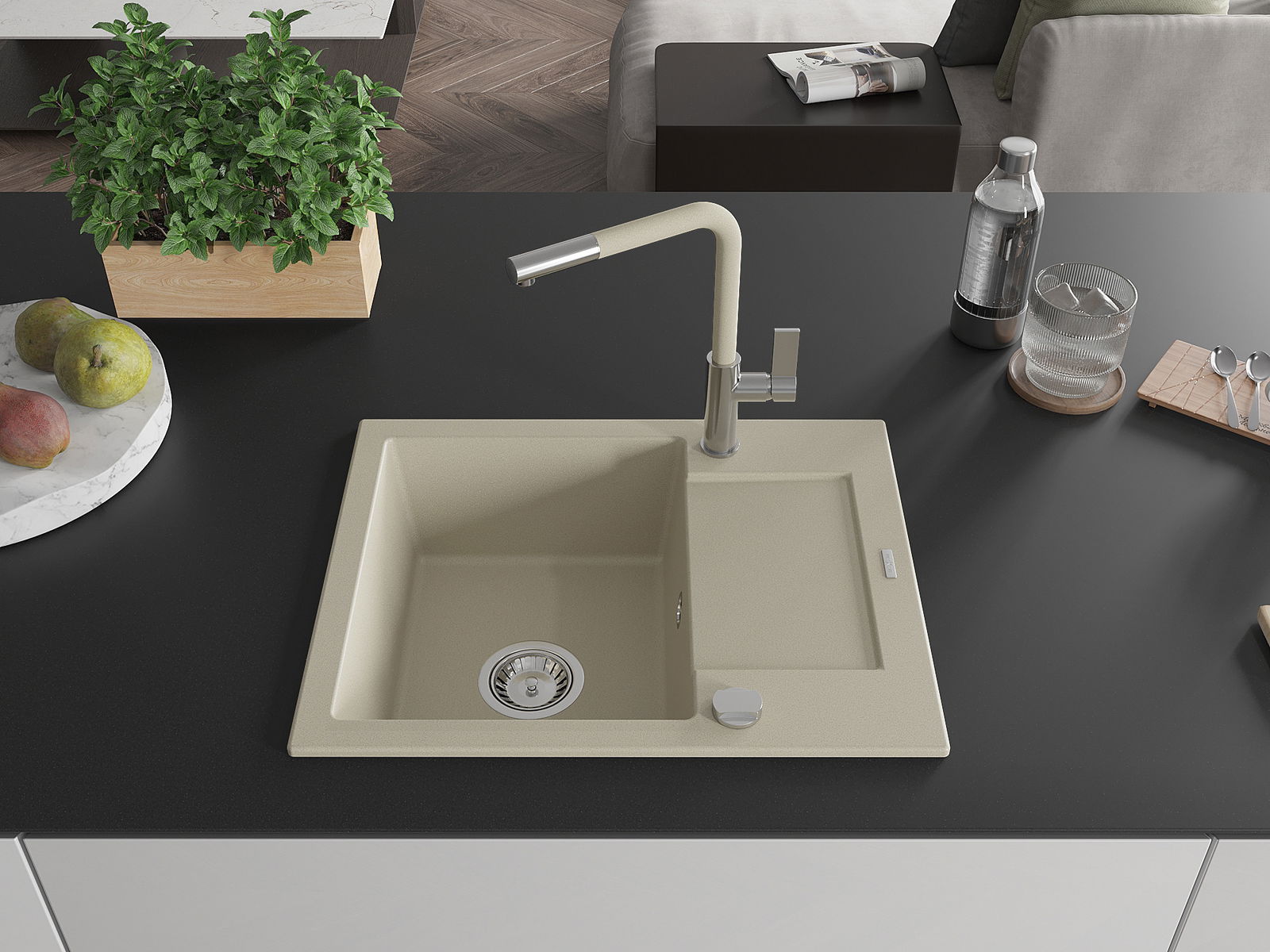 A mosogató magas minőségű gránitból készült. Elegáns, de mindenekelőtt praktikus kiegészítője minden konyhának, függetlenül annak stílusától. A gránit magas minősége és tartóssága hosszú távú használatot biztosít.