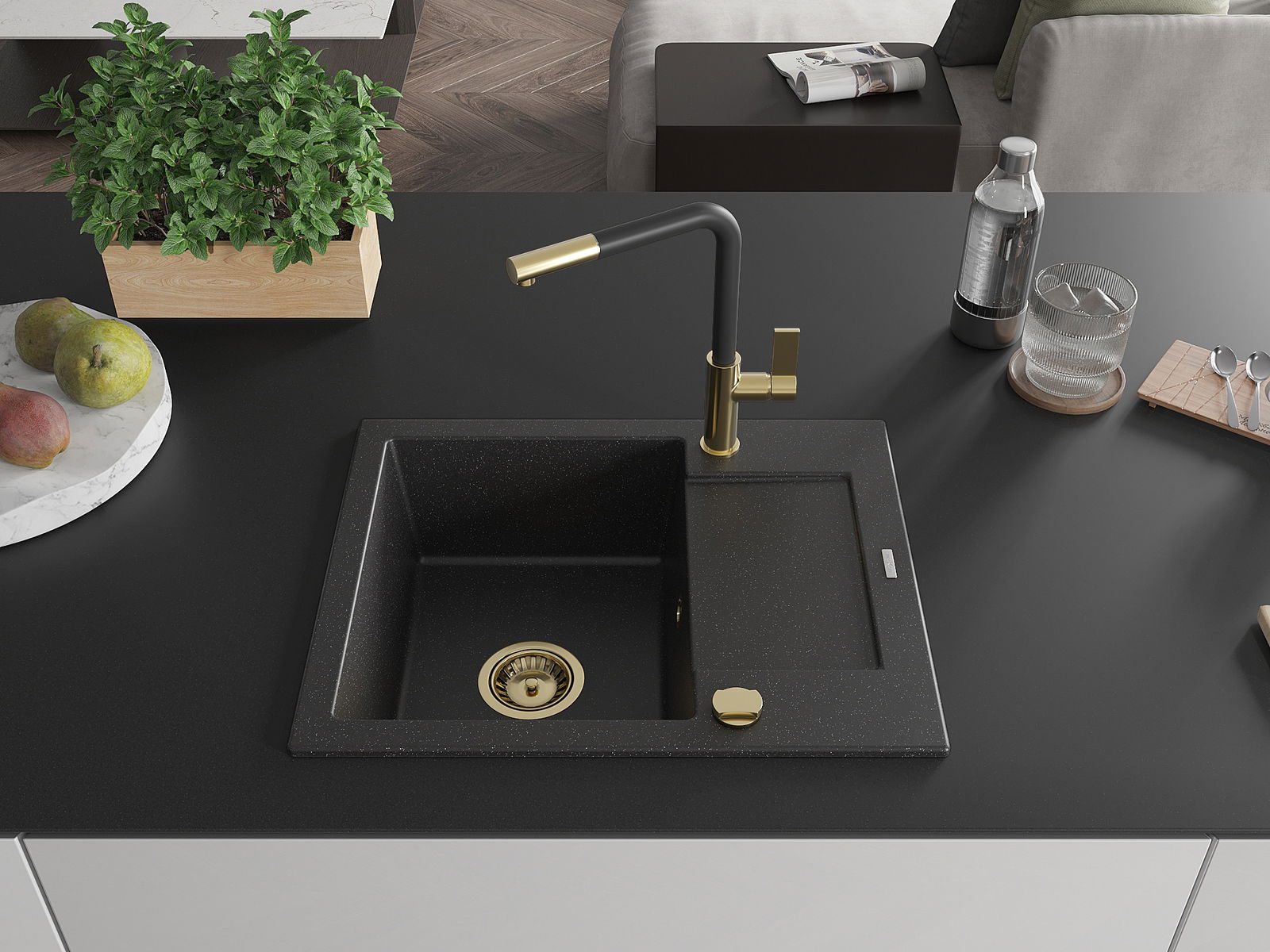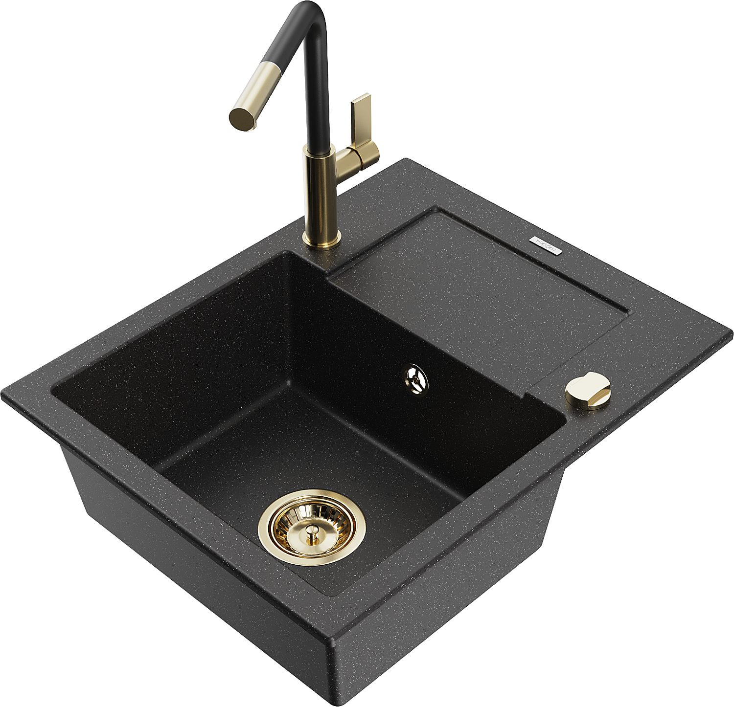 Mexen Enzo gránit egymedencés mosogató csepegtetővel és Flora konyhai csapteleppel, fekete/ezüst metál - 6506-73-670401-57-G