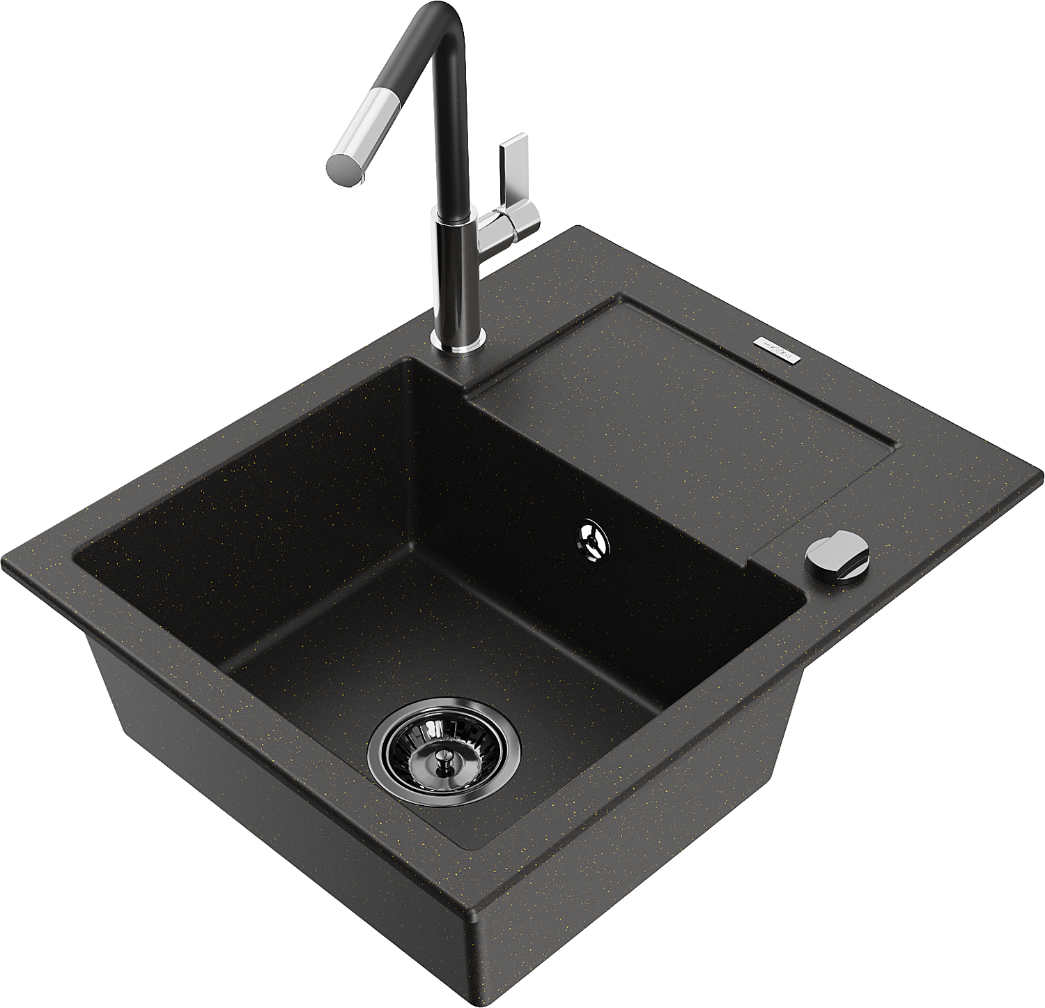 Mexen Enzo gránit mosogató 1-medencés csepegtetővel és Flora konyhai csapteleppel, fekete/arany metál - 6506-75-670401-07-B