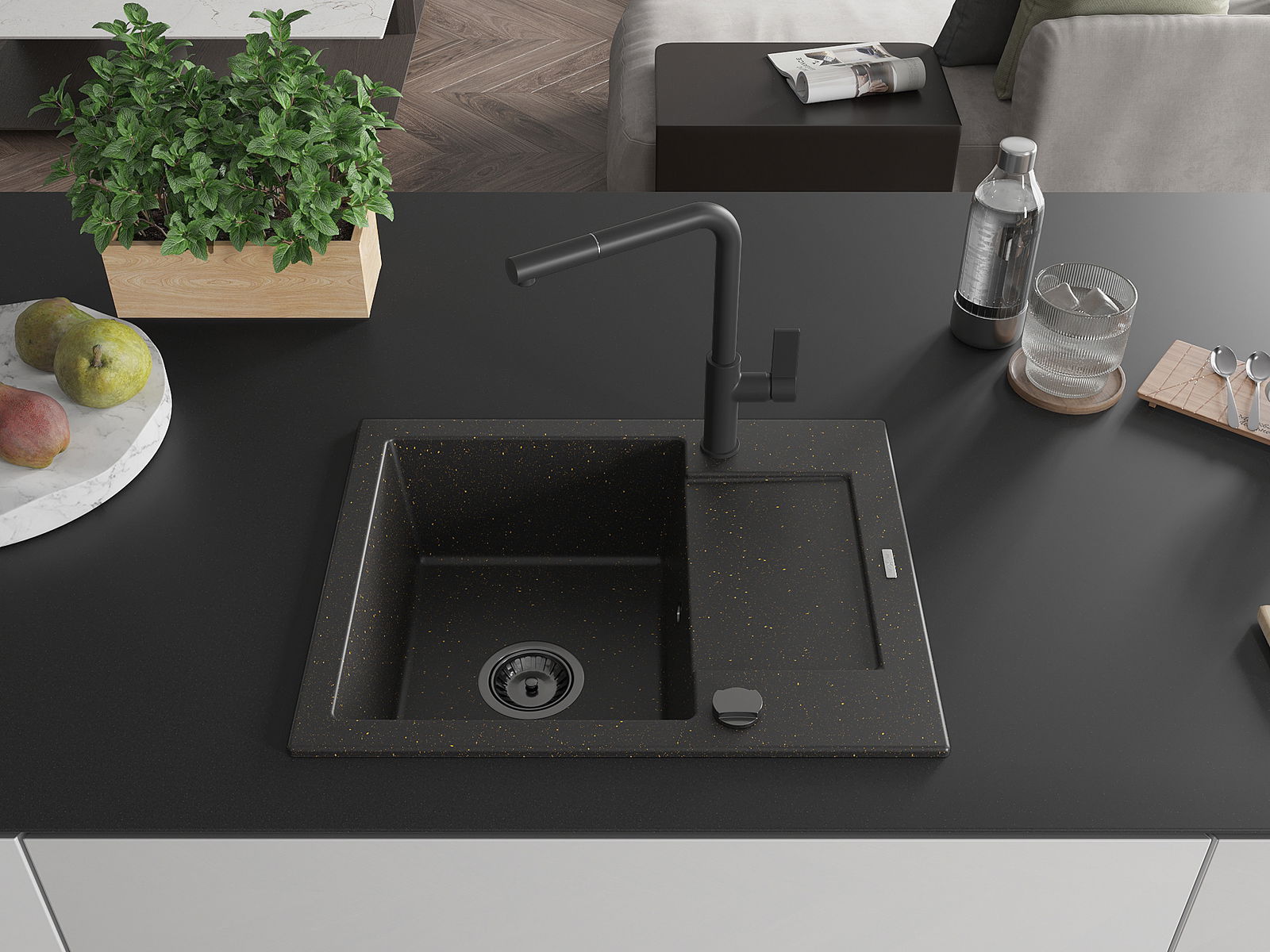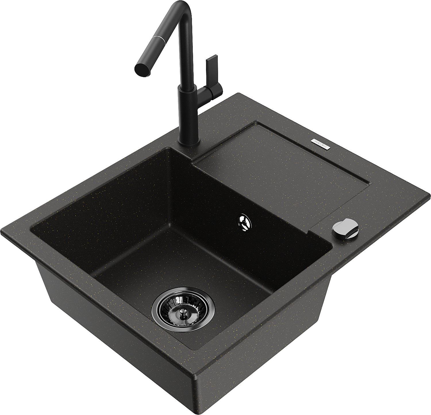 Mexen Enzo 1-kamrás gránit mosogató csepegtetővel és Flora konyhai csapteleppel, fekete/arany metál - 6506-75-670401-70-B